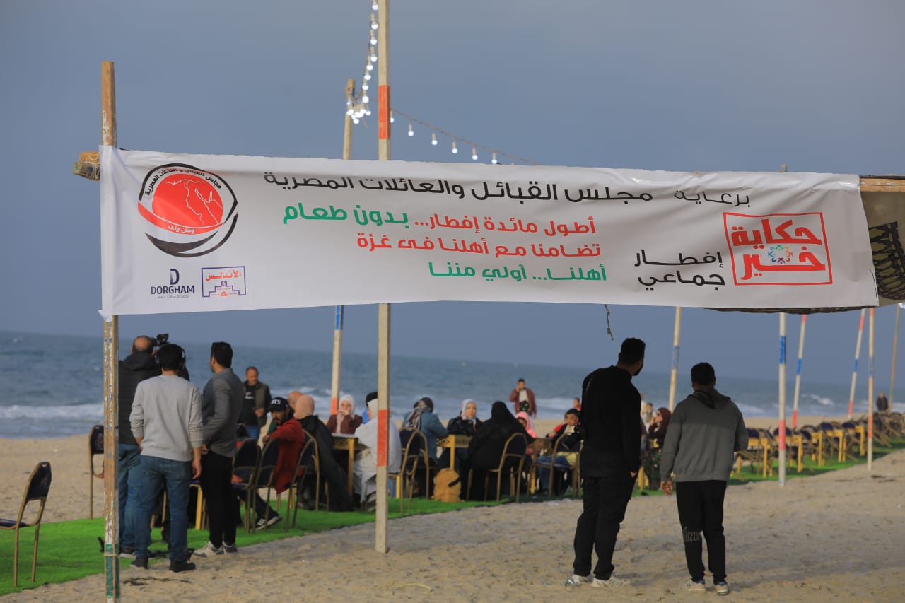 أشادت أسرة غزاوية بسيناء بأطول مائدة إفطار على ساحل مدينة العريش، «بدون طعام»، والتي تأتي تضامنًا مع الشعب الفلسطيني في قطاع غزة نظراً للأحداث التي يمر بها القطاع نتيجة العدوان الإسرائيلي.