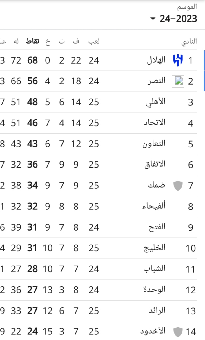 ترتيب الدوري السعودي.. الهلال يتصدر والنصر يقترب