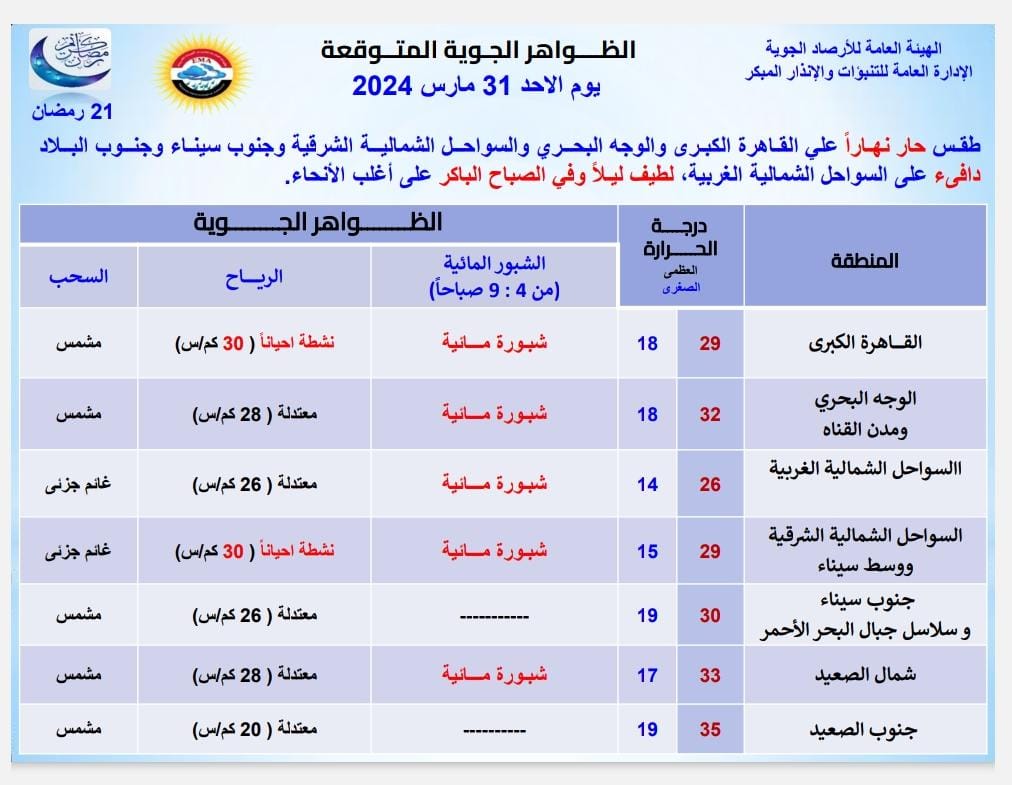 قالت هيئة الأرصاد الجوية، إن طقس غدا الأحد الموافق اليوم الحادي والعشرين من شهر رمضان المبارك، حار نهارا على القاهرة الكبرى والوجه البحري والسواحل الشمالية الشرقية وجنوب سيناء وجنوب البلاد، ودافئ على السواحل الشمالية الغربية، ولطيف ليلا وفي الصباح الباكر على أغلب الأنحاء.