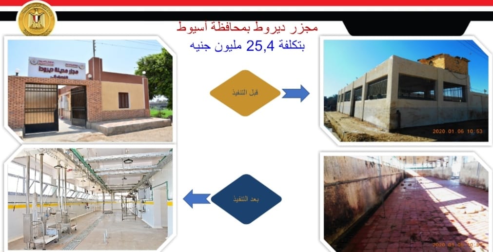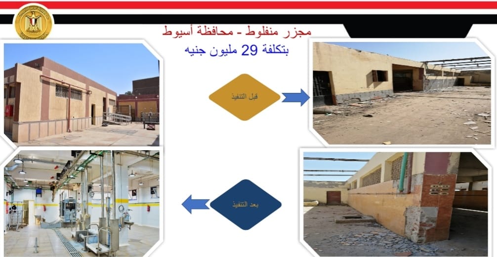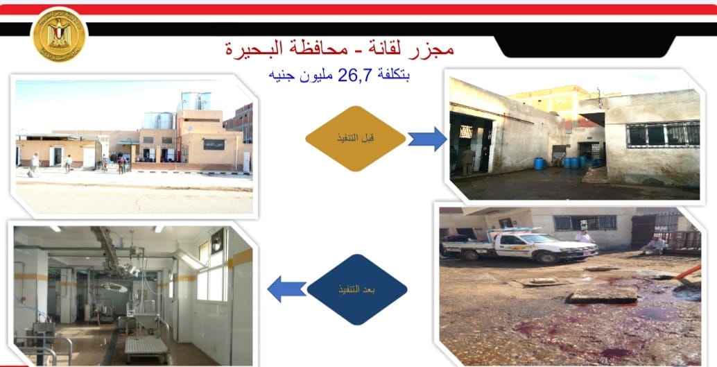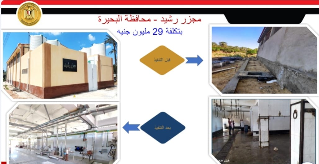 وأعلن وزير التنمية المحلية، أنه تم الإنتهاء من تطوير و تسليم 11 مجزراً حتى مارس 2024 ضمن المرحلة الأولى العاجلة لـ 6 محافظات بتكلفة إجمالية حوالى 313 مليون جنيه حيث تم نهو الأعمال الاعتيادية بها وتسليم كافة المعدات الخاصة للمجازر بنسبة 100%، مشيراً إلى أن المجازر التي تسليمها هي مجزرى رأس غارب وسفاجا بمحافظة البحر الأحمر ، ومجزرى لقانة ورشيد بمحافظة البحيرة، ومجزر المنصورة بمحافظة الدقهلية، ومجزر شونى بمحافظة الغربية، ومجزر التل الكبير بمحافظة الإسماعيلية، وعدد 4 مجازر بمحافظة أسيوط هي منفلوط و ديروط و الغنايم و منقباد.