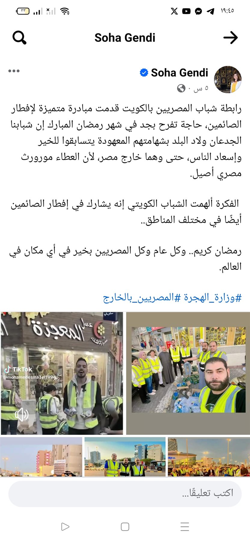 وتابعت: "الفكرة ألهمت الشباب الكويتي إنه يشارك في إفطار الصائمين أيضًا في مختلف المناطق، رمضان كريم.. وكل عام وكل المصريين بخير في أي مكان في العالم".