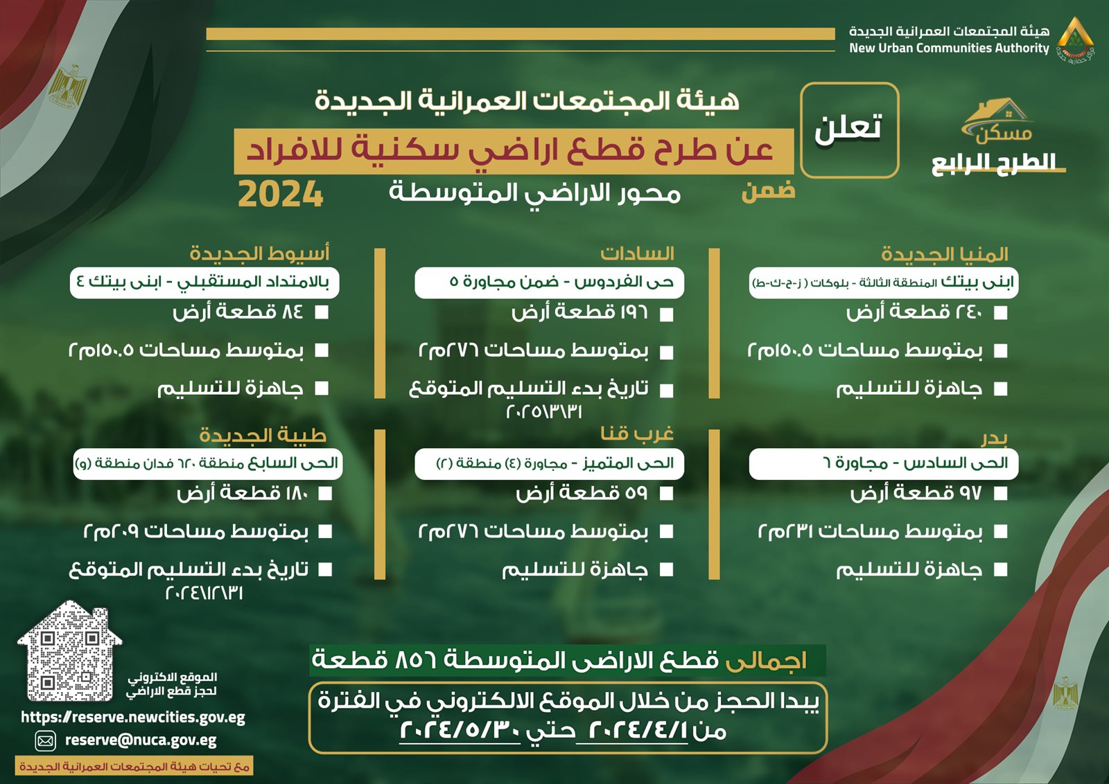 بحسب ما أعلنت هيئة المجتمعات العمرانية الجديدة، فإنه تم طرح 856 قطعة أرض بمحور الأراضي المتوسطة، بمدن: (السادات - المنيا الجديدة - أسيوط الجديدة - بدر - غرب قنا - طيبة الجديدة).