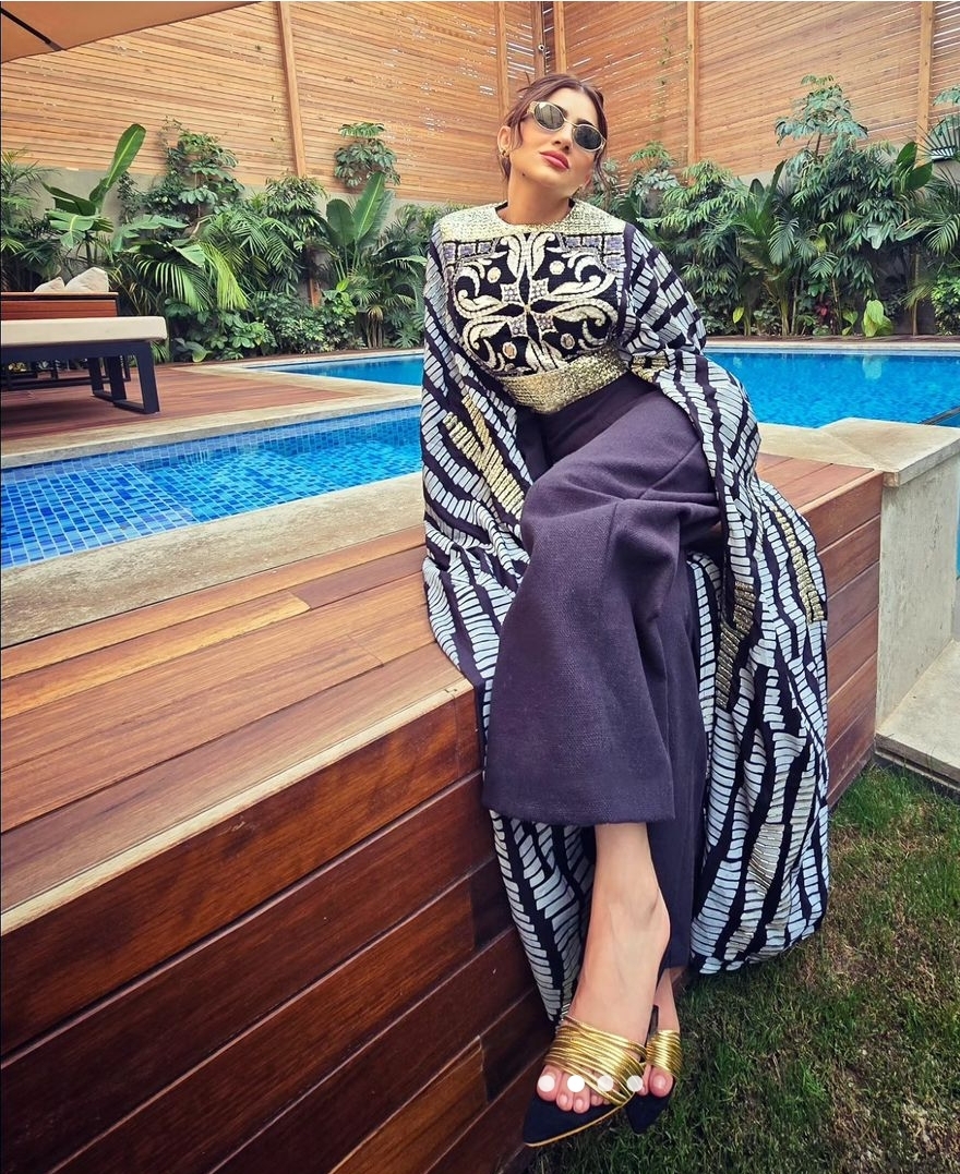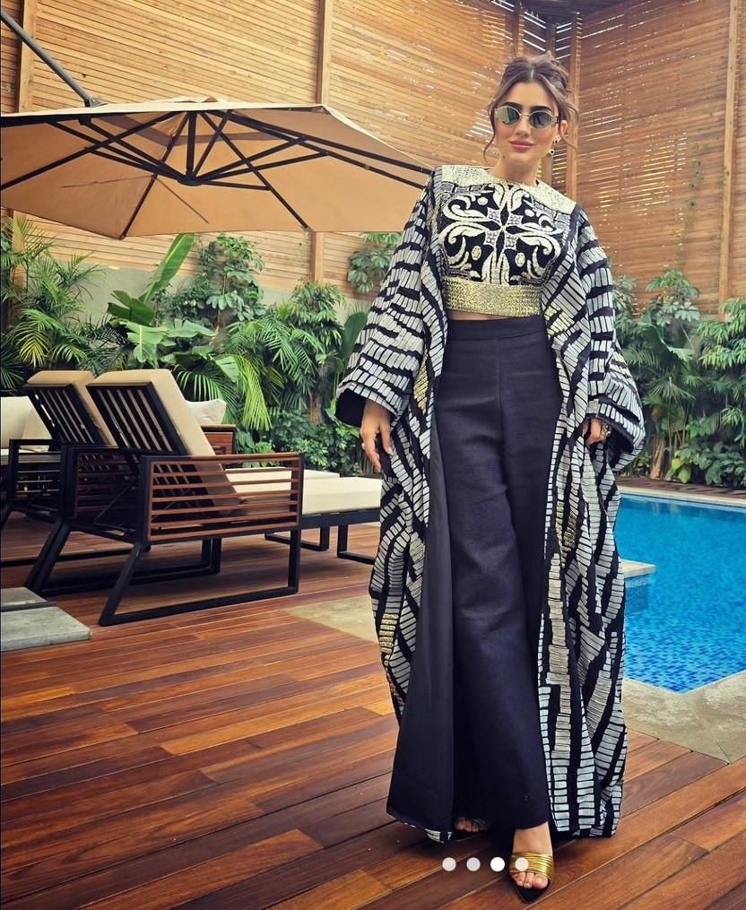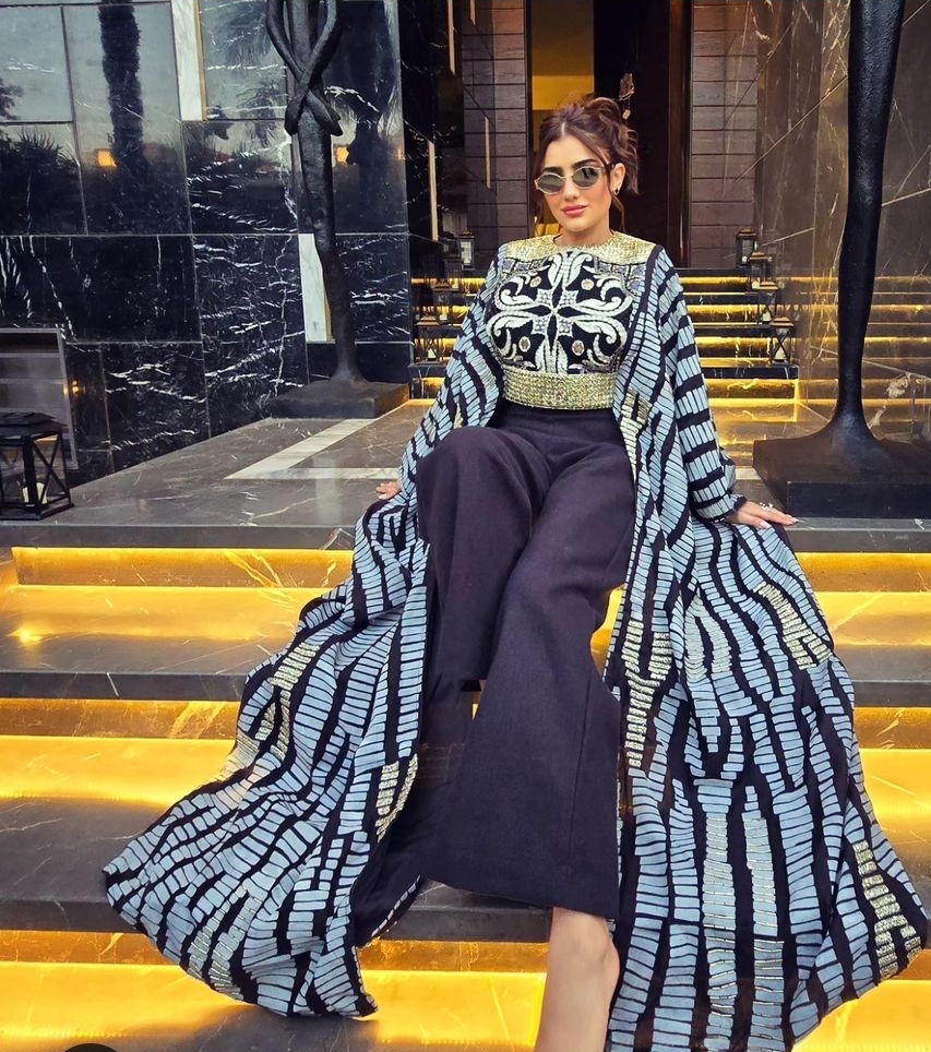بدت مي عمر بإطلالة محتشمة، حيث ارتدت بلوزة قصيرة بأكمام طويلة مصمم من قماش ناعم مضلع ومزين بالخيوط الذهبية والرسومات الهندسية يشبه الطابع العثماني في أناقته وجاذبيته، ونسقت عليها بنطال ينتمي لصيحة الهاي ويست باللون البنفسج فيما انتعلت سليبر ذهبي جذاب التصميم.