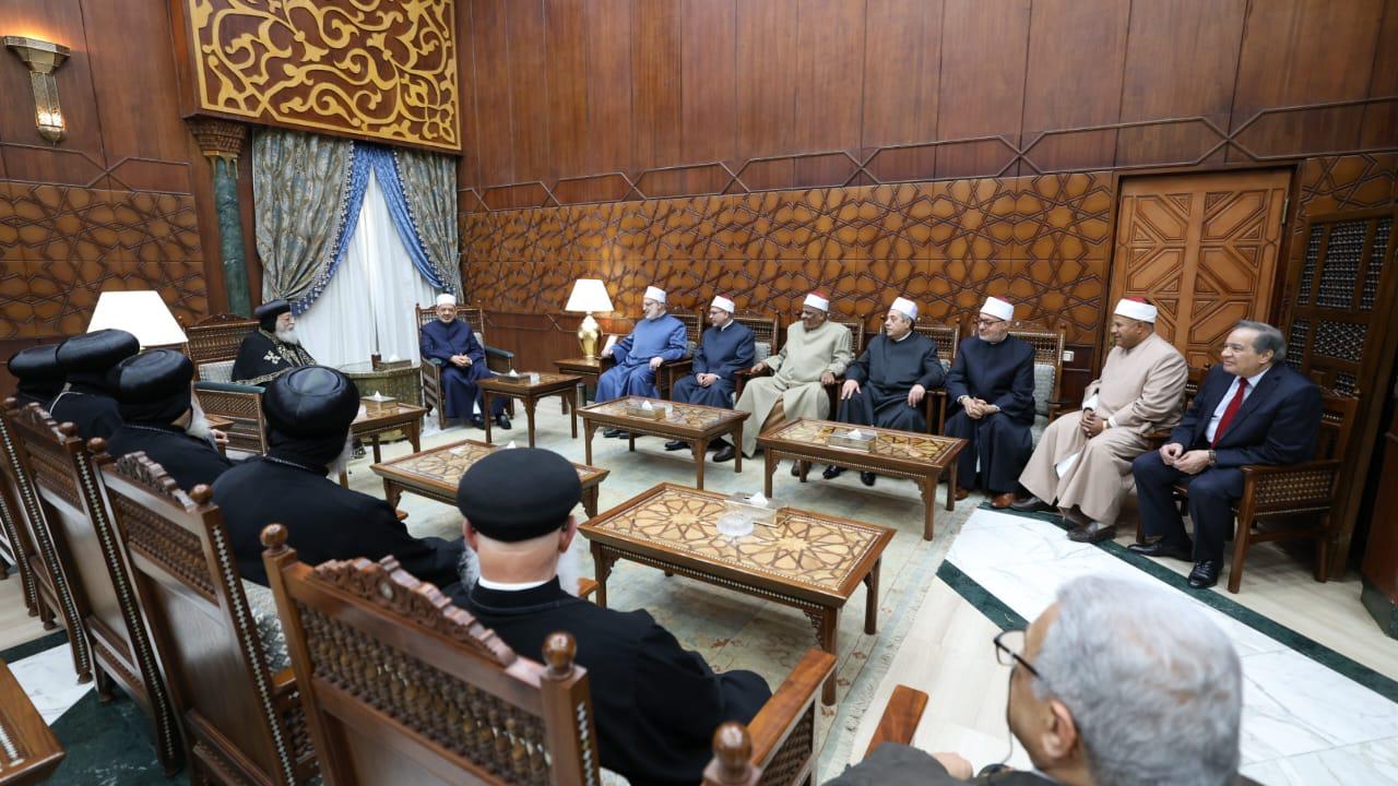 من جانبه، رحَّب الإمام الأكبر بقداسة البابا تواضروس الثاني والوفد رفيع المستوى المرافق ‏له، في رحاب الأزهر الشريف، مصرحًا فضيلته: «أهلًا وسهلًا بكم في رحاب الأزهر، ‏ونشكركم على مشاعركم الطيبة، ونقدِّر هذه الزيارة التي تعكس علاقة الصداقة والأخوة التي ‏تجمعنا نحن المصريين؛ مسلمين ومسيحيين، وتؤكِّد عمق علاقاتنا وتماسكنا في نسيج وطني ‏واحد، ولكننا في الوقت ذاته نشعر بحزن شديد لقرب حلول عيد الفطر المبارك وإخواننا في ‏غزة لا يزالون يعانون من العدوان الصهيوني المجرم الذي استباح كل مظاهر الحياة في غزة، ‏فقتَّل الأطفال والشيوخ والنساء والشباب، واستهدف النازحين، وهدَّم البيوت والمستشفيات ‏والمدارس، وحقيقة لا أجد تفسيرًا ولا مبررًا لما يحدث في غزة، سوى أنه إقصاء لصوت الدين ‏ومنظومة القيم والأخلاق والأعراف الإنسانية، وصم الأذان عن الاستماع لصوت الضمير ‏الإنساني».‏