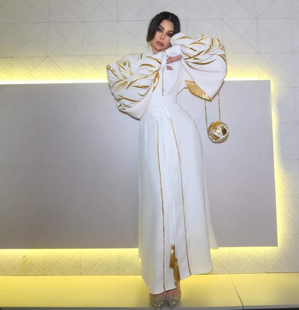 وتألقت هيفاء وهبي بإطلالة بيضاء ساحرة، حيث ارتدت قفطانا طويلا، فضفاضا، بأكمام طويلة، صمم من قماش الحرير الأبيض، مزين بالخيوط الذهبية، عكست قوامها الممشوق ووزنها المثالي بشكل ناعم وجذاب، فيما انتعلت حذاء بكعب عال وسيور مرصعه بحبات الكريستال.