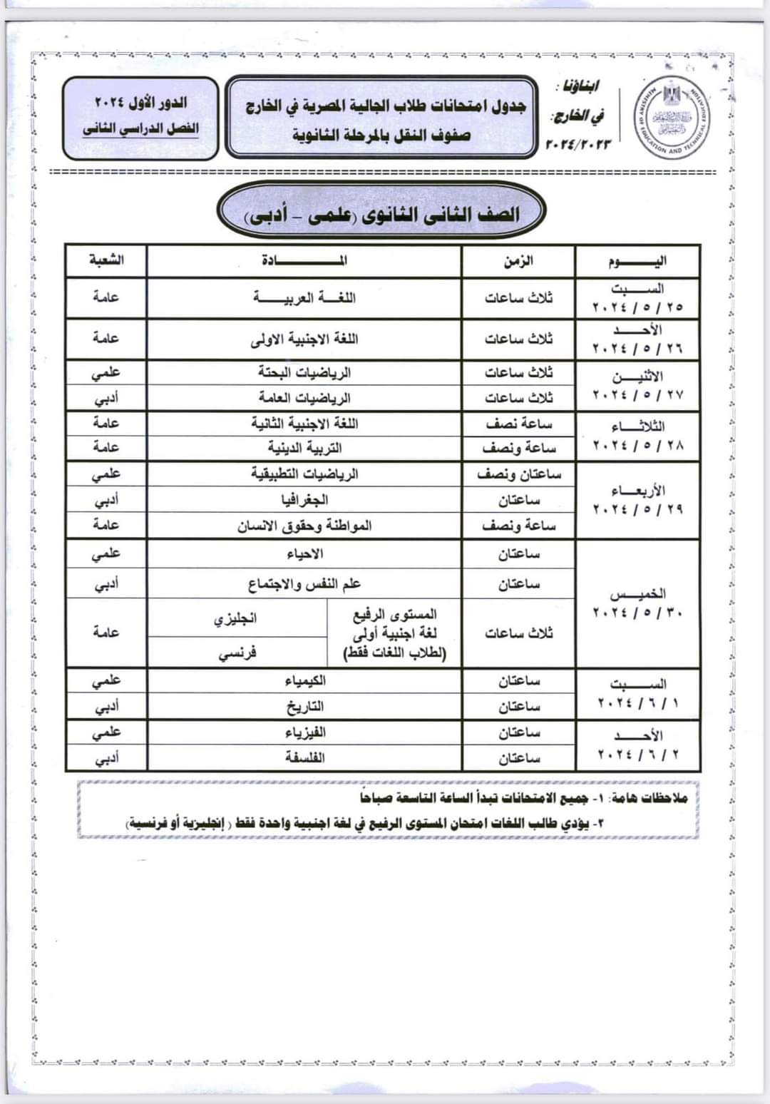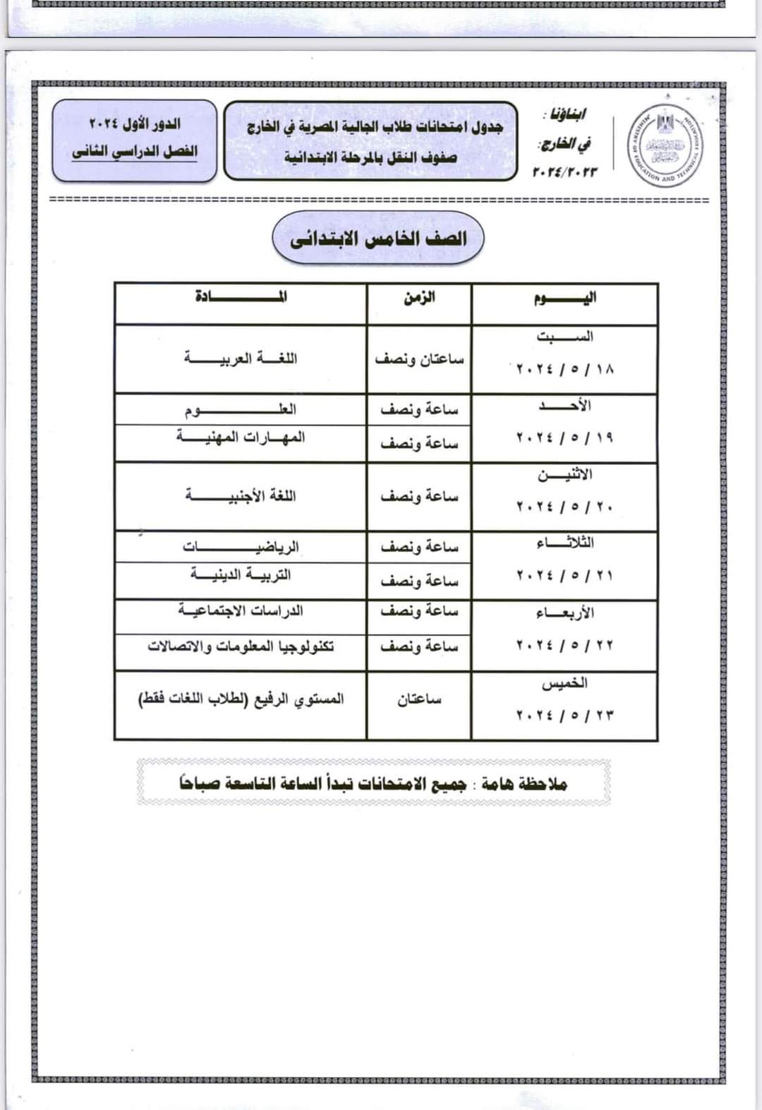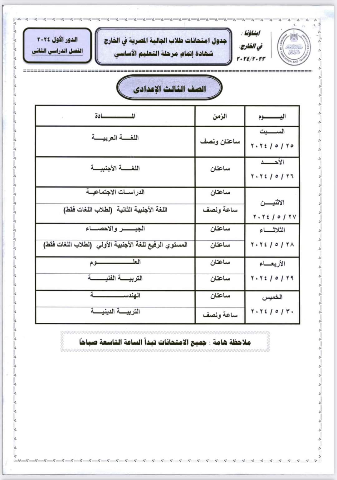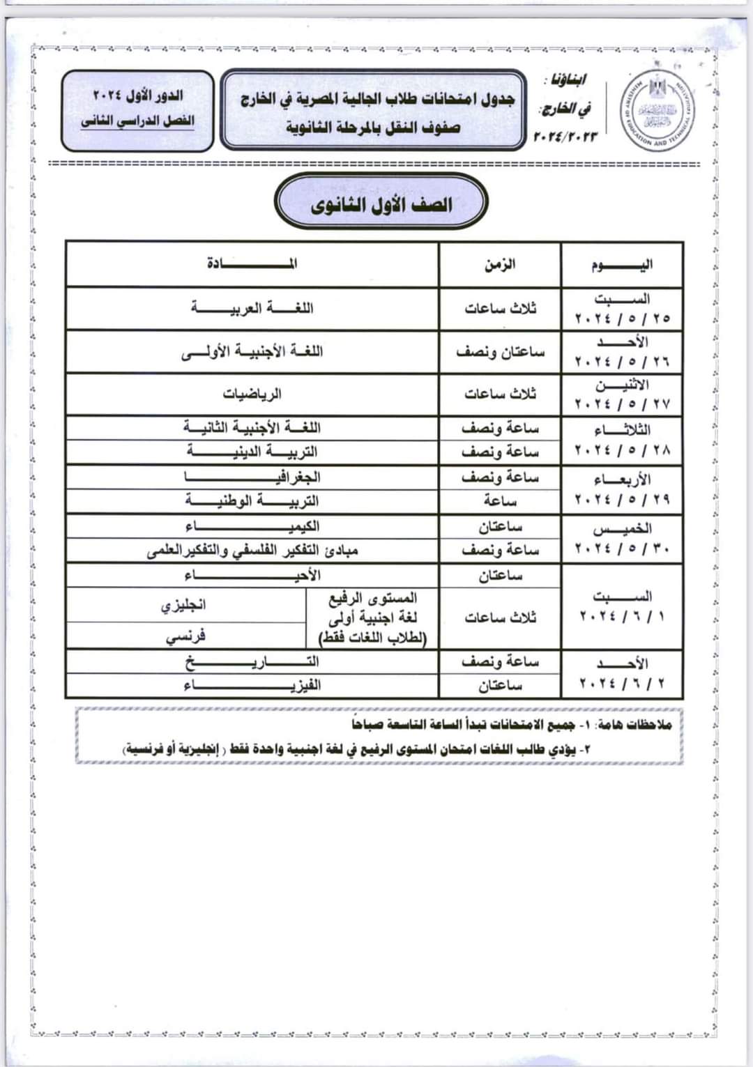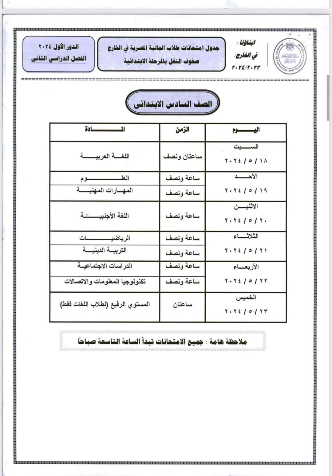 ننشر جداول امتحانات أبنائنا في الخارج 2024 لجميع الصفوف