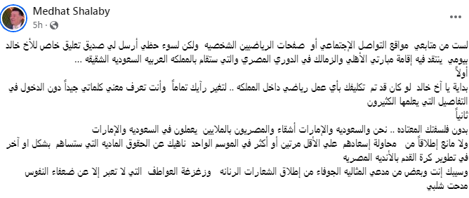 وأضاف: “ ثانياً بدون فلسفتك المعتاده .. نحن والسعوديه والإمارات أشقاء والمصريون بالملايين يعملون في السعوديه والإمارات ولا مانع إطلاقاً من محاولة إسعادهم علي الأقل مرتين أو أكثر في الموسم الواحد ناهيك عن الحقوق الماديه التي ستساهم بشكل او آخر في تطوير كرة القدم بالأنديه المصريه ، وسيبك إنت وبعض من مدعي المثاليه الجوفاء من إطلاق الشعارات الرنانه وزغزغة العواطف التي لا تعبر إلا عن ضعفاء النفوس ”.