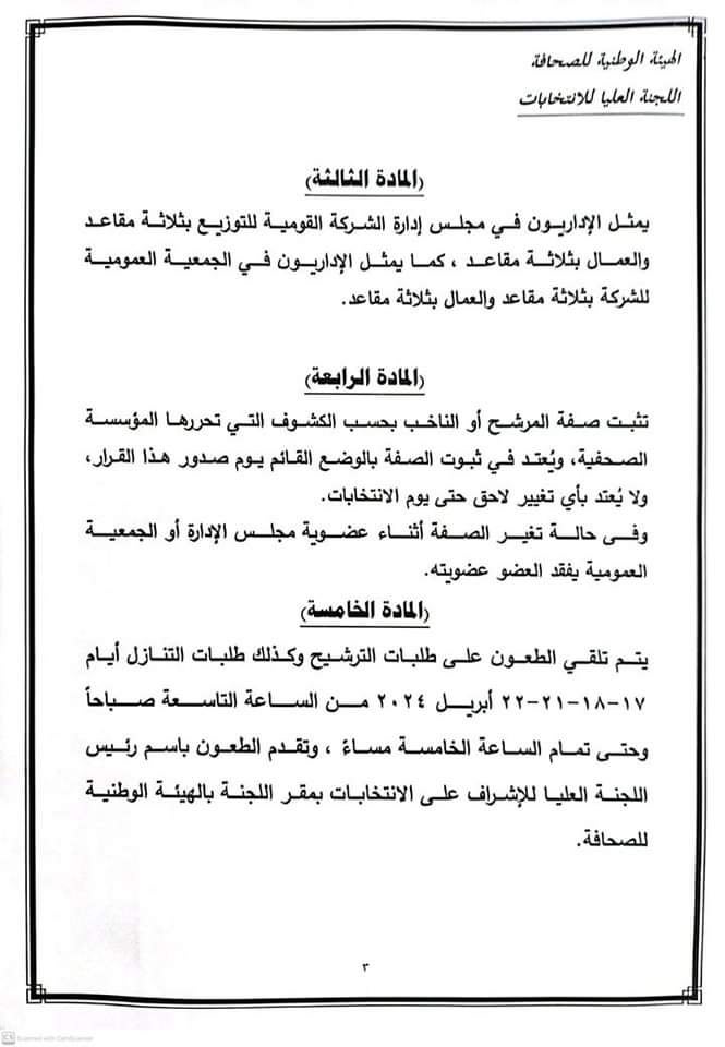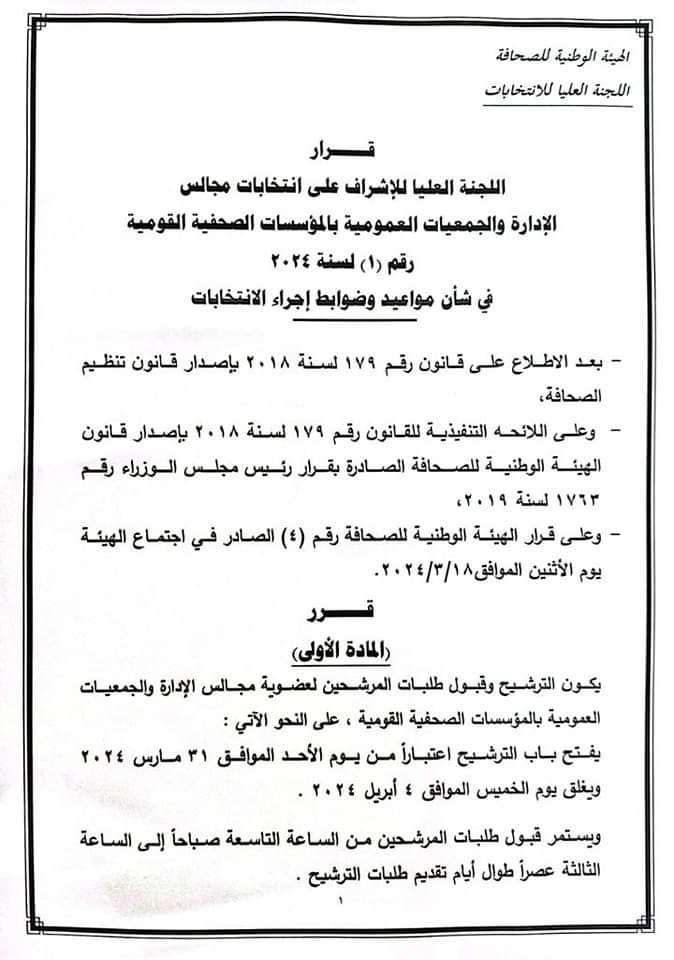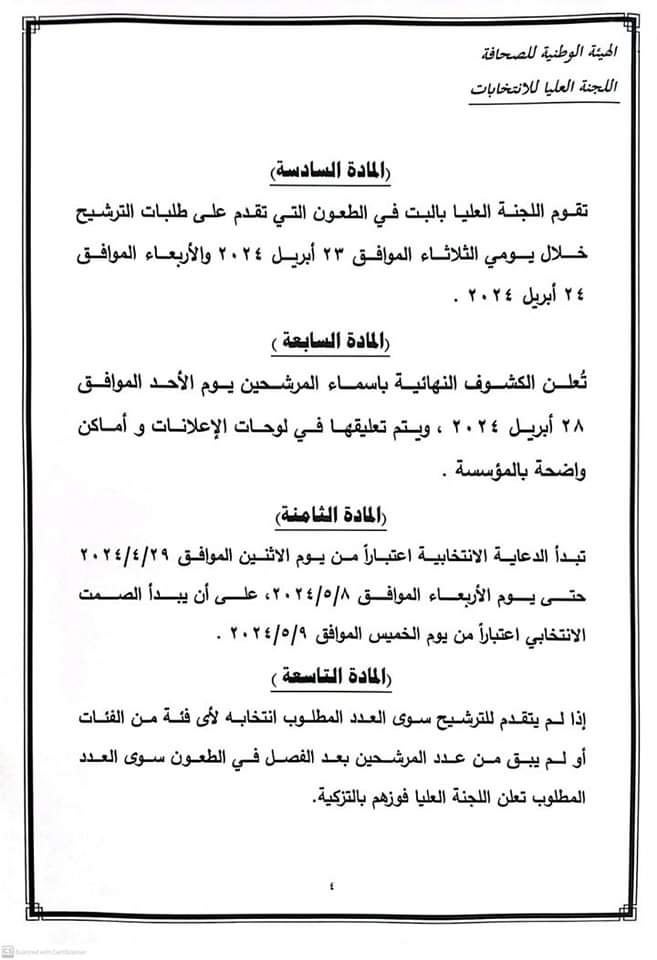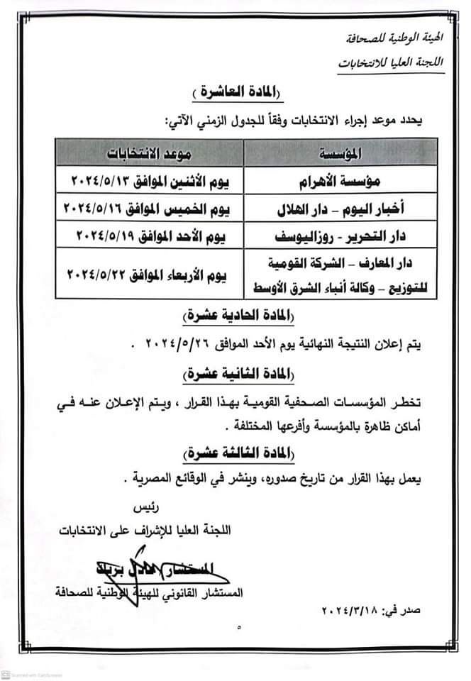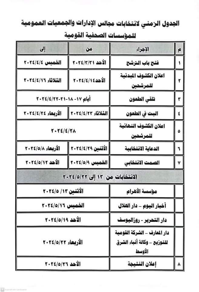 وتبدأ الدعاية الانتخابية اعتبارا من يوم الاثنين الموافق 29-4-2024 وحتى يوم الأربعاء الموافق 8-5-2024، على أن يبدأ الصمت الانتخابي اعتبارا من يوم الخميس الموافق 9-5-2024، ومن المقرر أن تنطلق الانتخابات على مدار أيام 13، 16، 19 و22 مايو 2024 بالمؤسسات الصحفية القومية، ويتم إعلان النتيجة النهائية يوم الأحد الموافق 26 -5-2024.