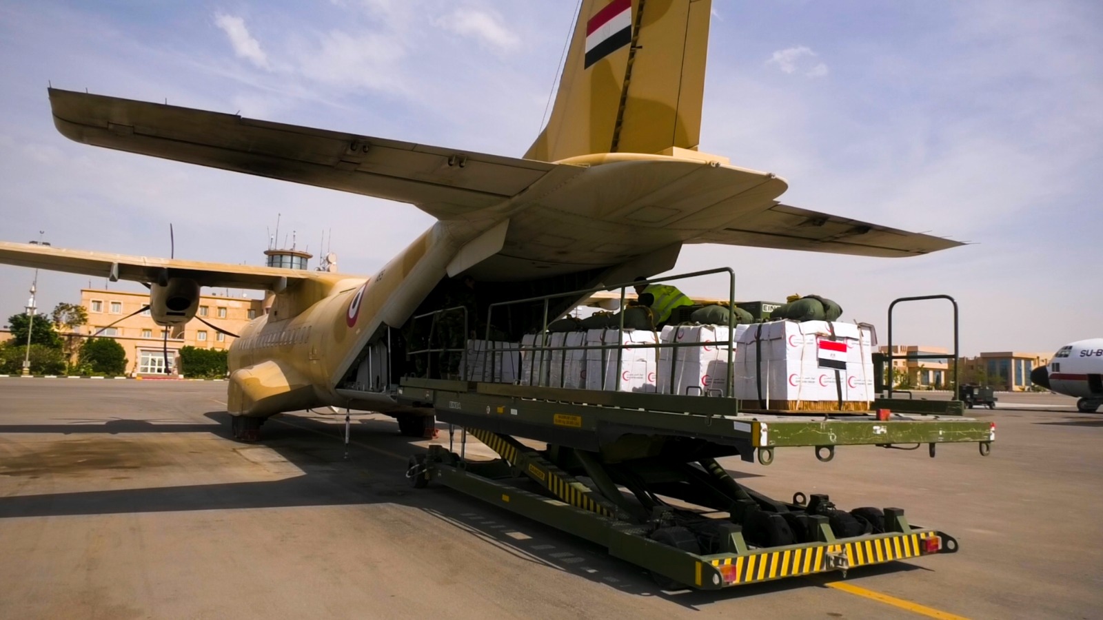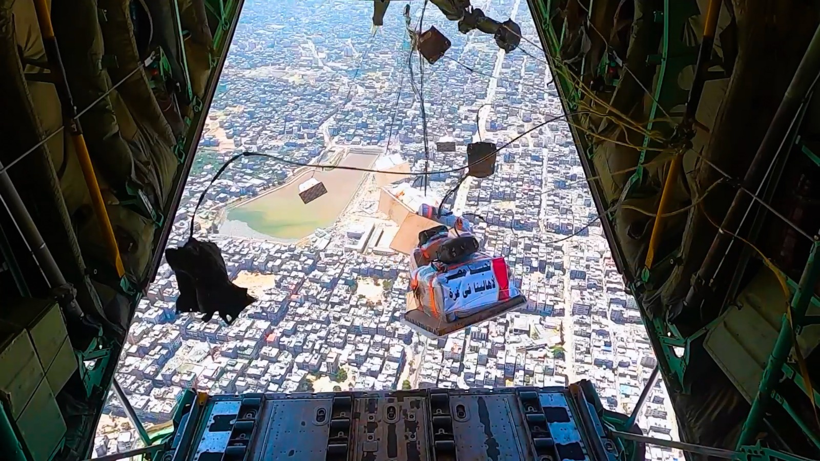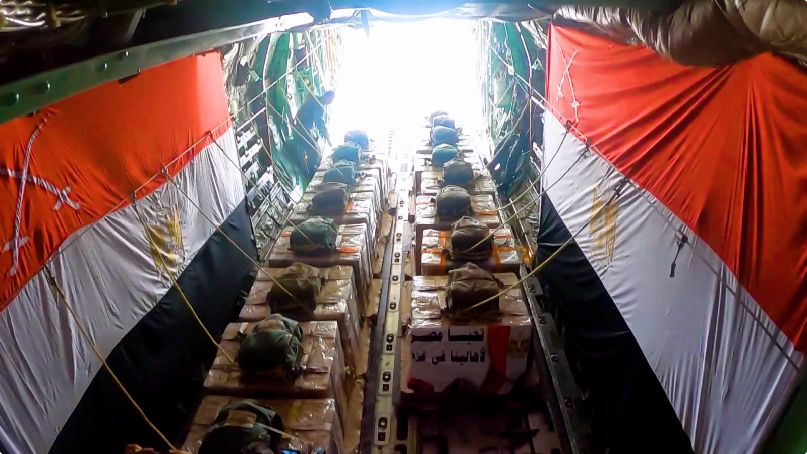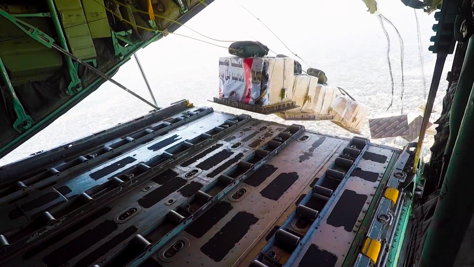 حيث أقلعت عدد من طائرات النقل العسكرية المصرية من جمهورية مصر العربية والمملكة الأردنية الهاشمية لتنفيذ أعمال الإسقاط الجوى اليومى للمساعدات الإنسانية على المناطق المعزولة بشمال قطاع غزة وذلك بالتعاون مع الدول الشقيقة والصديقة المشاركة بالتحالف الدولى .