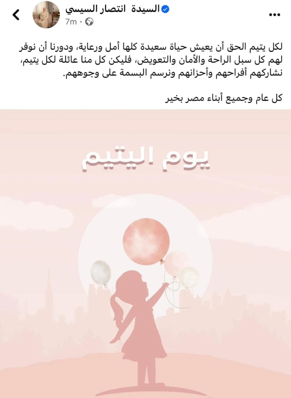عاجل.. رسالة مهمة من قرينة الرئيس السيسي بمناسبة يوم اليتيم