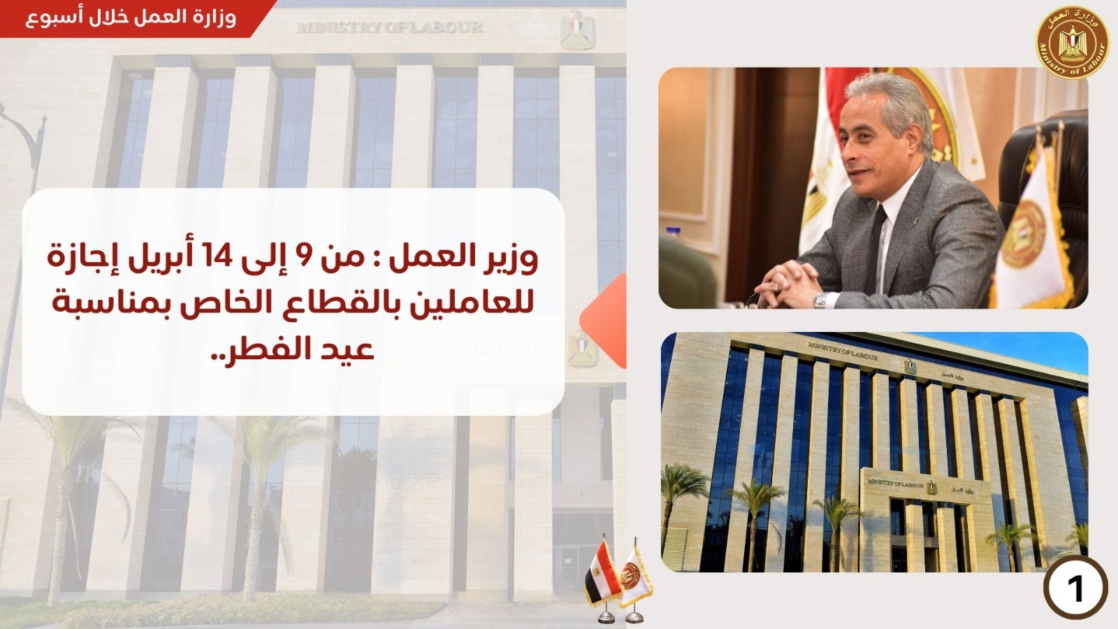 أعلنت وزارة العمل خلال الأسبوع الأخير، عدد من القرارات أهمها إجازة عيد الفطر المبارك للعاملين بالقطاع الخاص، بالإضافة لفرص عمل جديدة للشباب في عدد من المحافظات برواتب جيدة.