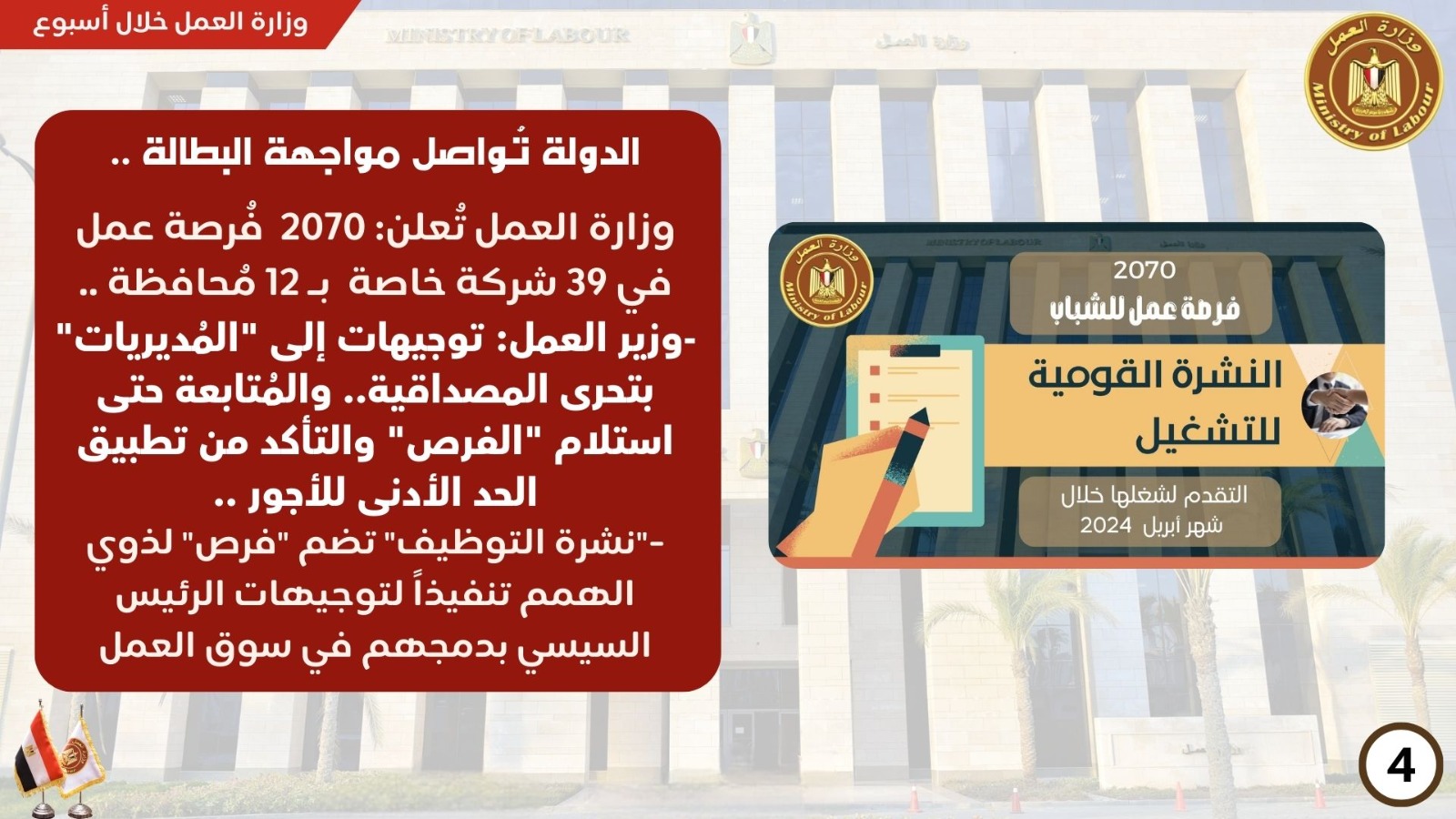أصدرت وزارة العمل هذا الأسبوع، نشرة التوظيف نصف الشهرية، التي تُعلن فيها عن فرص عمل جديدة في المحافظات تنسيقًا مع شركات القطاع الخاص.