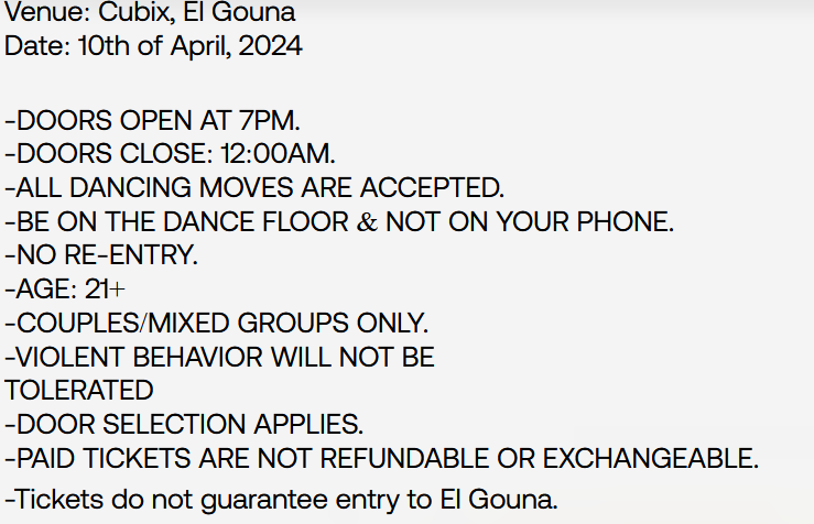 وتضمن الحفل عدد من الشروط أهمها ممنوع الدخول لمن هم دون 21 عامًا، بجانب منع التصوير بكاميرات المحمول، والدخول مخصص للثنائيات والمجموعات فقط.، كما يمنع الخروج من الحفل قبل موعد انتهاءها.
