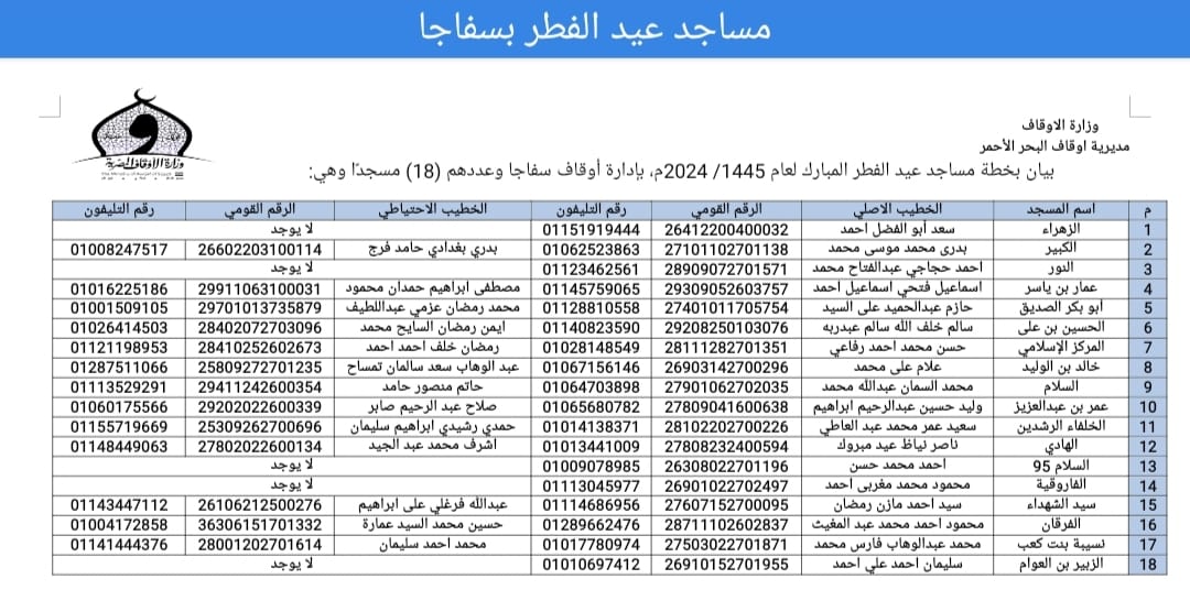 وقال الدكتور هانى السباعى وكيل وزارة الاوقاف بالبحر الأحمر أنّ مساجد أداء صلاة عيد الفطر التي تم تخصيصها عددها 195 مسجدًا و 8 ساحات، موزعة بمعدل 104 مسجد في الغردقة و18 مسجدًا في رأس غارب، و18 مسجدًا في سفاجا و20 مسجدًا في القصير، و9 مساجد في مرسى علم و24 مسجدًا في حلايب وشلاتين، بالإضافة إلى ساحتين براس غارب وساحة بسفاجا و 3ساحات بالقصير وساحة بحلايب وساحة بالشلاتين، وذلك بناء على تعليمات الدكتور محمد مختار جمعة، وزير الأوقاف.