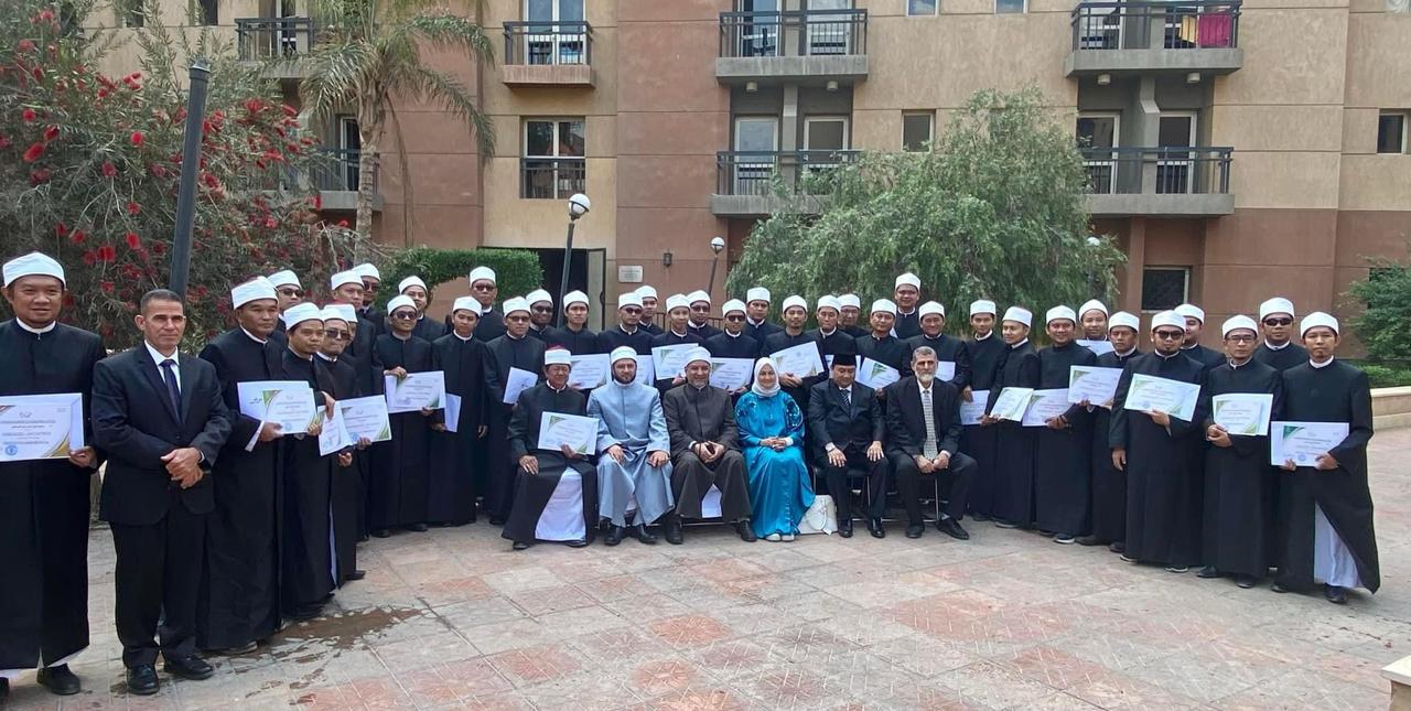 احتفلت أكاديمية الأزهر العالمية لتدريب الأئمة والوعاظ، بتخريج دفعة جديدة من الأئمة الوافدين من دولة " إندونيسيا " المشتركين في عدد من الدورات التدريبية بالأكاديمية، والتي استمرت فعاليتها لمدة شهرين، بمشاركة (٤٠) إمامًا وداعية، وذلك بحضور الدكتور حسن الصغير، رئيس أكاديمية الأزهر العالمية، والدكتورة نهلة الصعيدي، مستشار فضيلة الإمام الأكبر لشئون الوافدين، والدكتور عبد العالي، المستشار التربوي والثقافي بسفارة جمهورية " إندونيسيا " بالقاهرة.