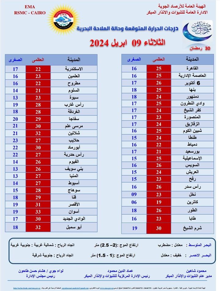 ونرصد درجات الحرارة الصغرى والعظمى المتوقعة اليوم بعدد من المدن والمحافظات..