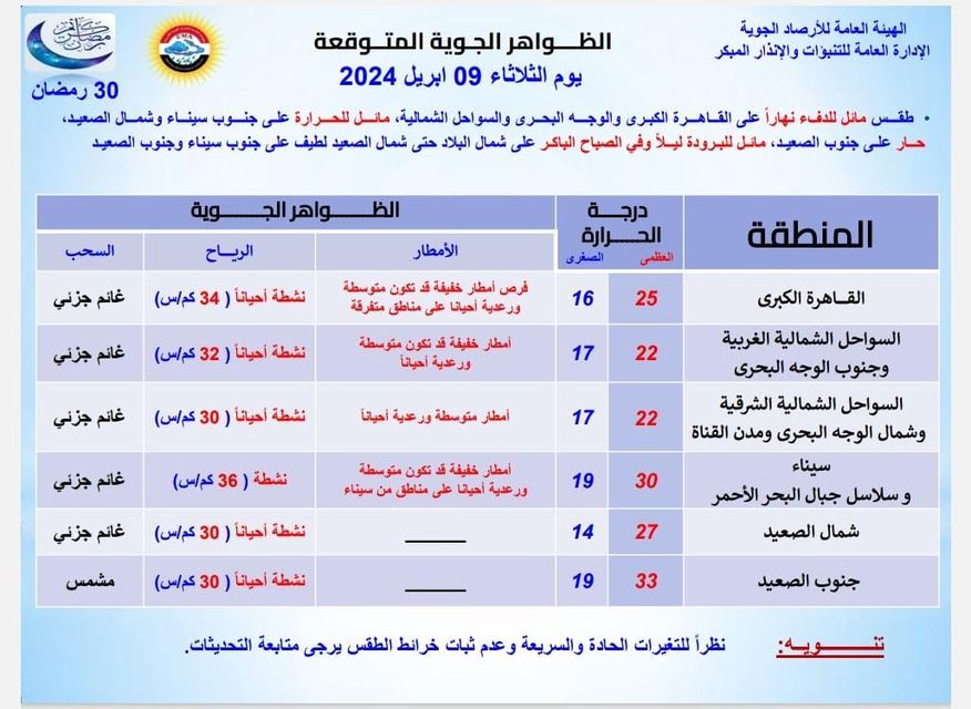 وكانت الهيئة العامة للأرصاد الجوية توقعت طقس مائل للدفء نهارًا على القاهرة الكبرى والسواحل الشمالية، مائل للحرارة على جتوب سيناء وشمال الصعيد، حار على جنوب الصعيد، مائل للبرودة في الصباح الباكر وفترات الليل وذلك على شمال البلاد حتى شمال الصعيد لطيف على جنوب سيناء وجنوب الصعيد، وذلك مع استمرار الأجواء المتقلبة التي حلت على عدد من المحافظات أمس.