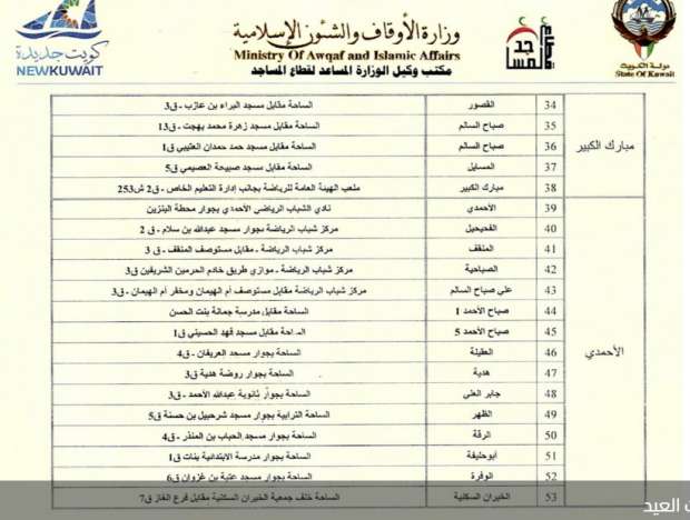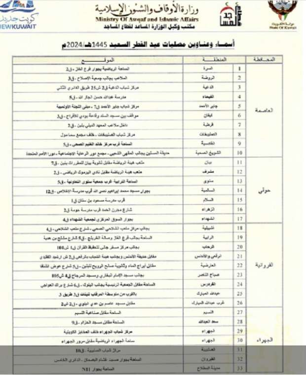 وذكرت الوزارة في بيان، اليوم الاثنين، نقلته وكالة الأنباء الكويتية الرسمية «كونا»، أنّ وكيل الوزارة المساعد لشؤون قطاع المساجد بدر العتيبي، أصدر تعميمًا حدد فيه الساحات ومراكز الشباب والملاعب الرياضية، بمختلف المحافظات، والتي ستستقبل جمهور المصلين لأداء صلاة العيد فيها.
