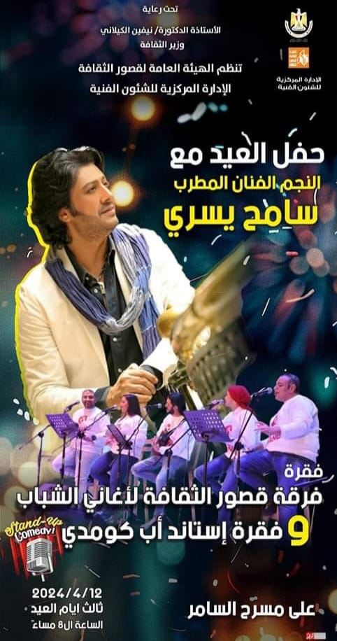 ويشهد مسرح السامر بالعجوزة حفلا غنائيا بالمجان ثالث أيام عيد الفطر، الجمعة 12 أبريل، في الثامنة مساءً، يحييه الفنان سامح يسري، ويتضمن عروضا فنيا لفرقة قصور الثقافة لأغاني الشباب، وفقرة ستاند أب كوميدي، وينفذ الحفل بإشراف الإدارة المركزية للشئون الفنية برئاسة الفنان تامر عبد المنعم.