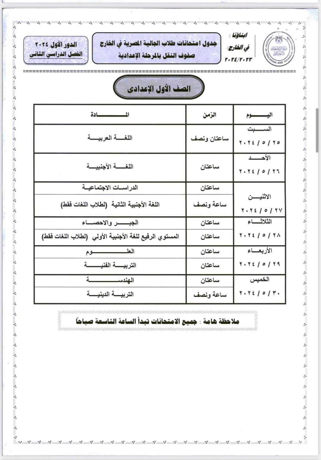أبناؤنا في الخارج| جدول امتحانات الصف الأول الإعدادي 2024