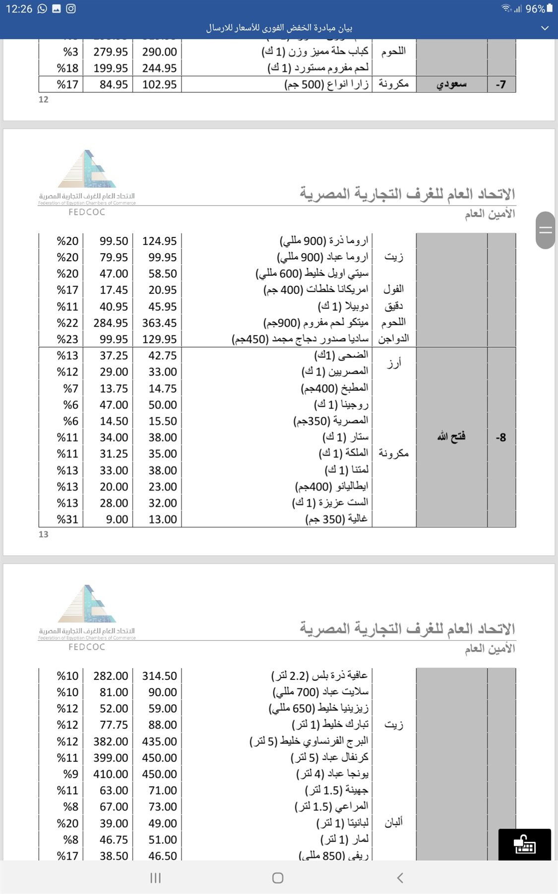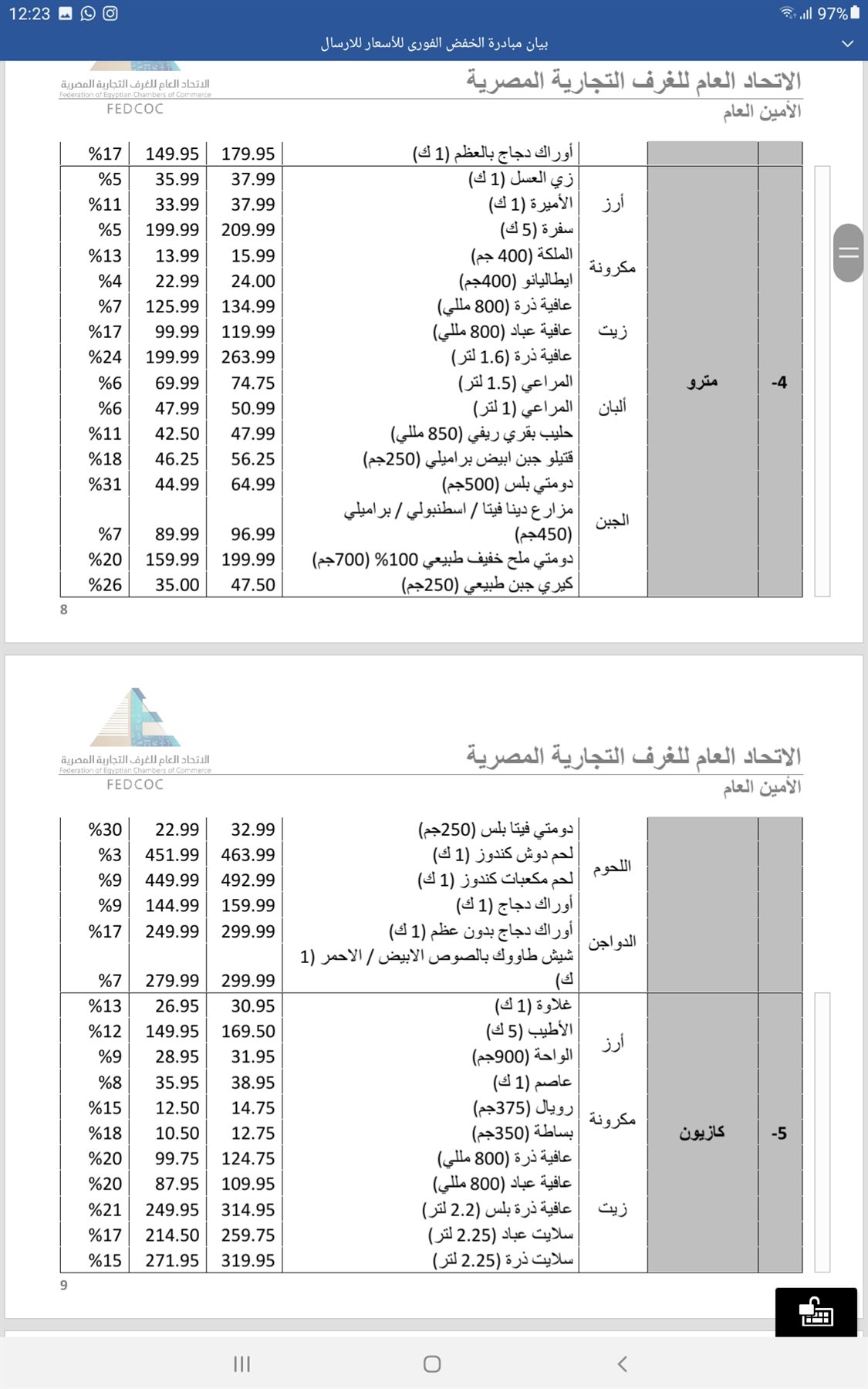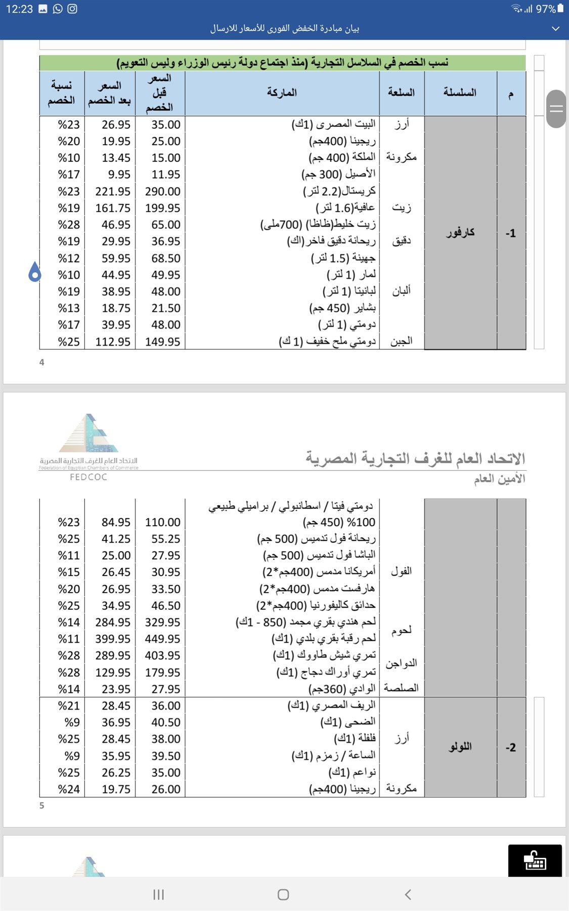 وأوضح البيان أن كبار منتجى السلع الأساسية قاموا بإصدار قوائم أسعار جديدة بعد لقاء رئيس الوزراء الدكتور مصطفى مدبولى حيث تم خفض الأسعار بها مقارنة بأسعار ما قبل التعويم بنسب تراوحت من 10% إلى 25% وقامت السلاسل التجارية الكبرى بخفض الأسعار بناء على تلك القوائم المرفقة.