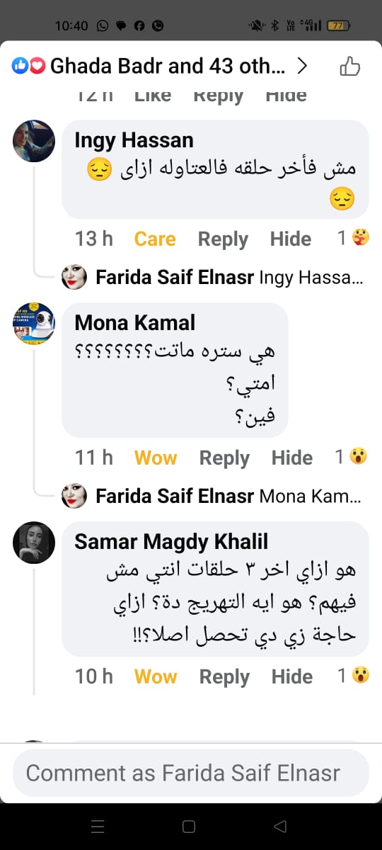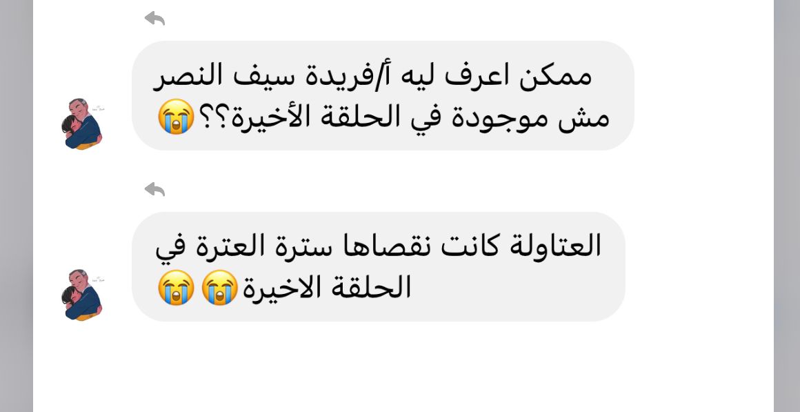 أضافت فريدة سيف النصر فى حديثها عن إثارتها جدلاً واسعاً وتصدرها التريند بغيابها عن آخر 3 حلقات، معلقه: " تضاعفت سعادتي بالمسلسل وحبي لجميع طاقم العمل، كما أن تساؤل الجمهور على سترة العترة لمس قلبي بحماسهم المبهر لمعرفة تفاصيل اختفائي.