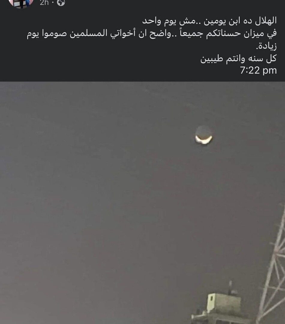 وانتشر عبر موقع التواصل الاجتماعي "فيس بوك" بوست لشخص يقول في: "هل الهلال ده ابن يومين ..مش يوم واحد.. وعموما ربنا يتقبل.. وفي ميزان حسناتكم جميعاً.. واضح اننا صمنا يوم زيادة".