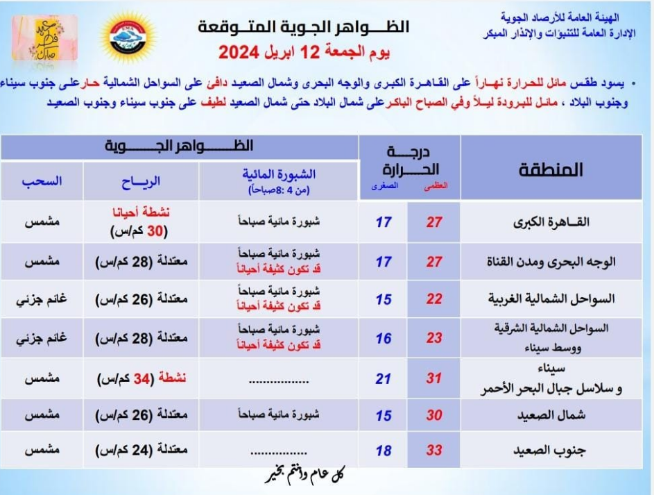 الأرصاد تكشف تفاصيل حالة الطقس غدا الجمعة ثالث أيام العيد