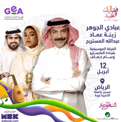 ليلة غنائية مميزة تجمع بين الفنان الكبير عبادي الجوهر والفنانة الصاعدة زينة عماد والفنان عبد الله المستريح في السعودية، ضمن فعاليات الاحفتال بعيد الفطر المبارك التي تجوب أنحاء المملكة.
