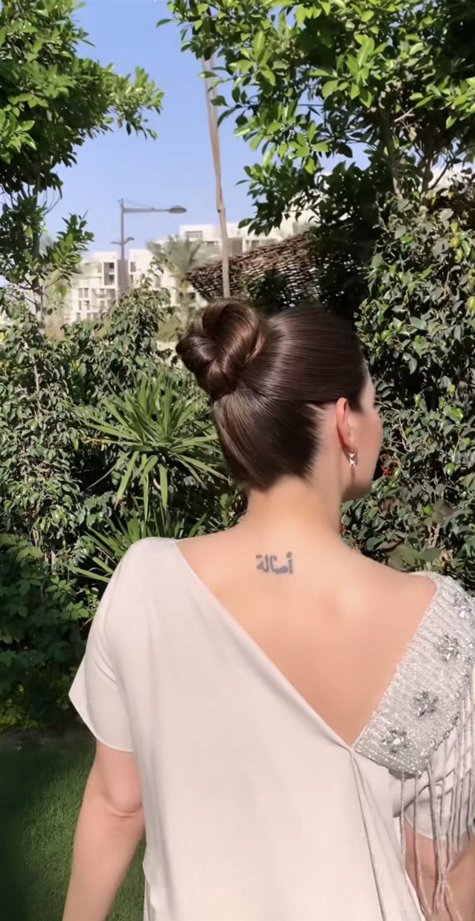 ومن الناحية الجمالية، إعتمدت شام الذهبي تصفيفة شعر بسيطة، فقامت بربط خصلاتها شكل الكعكة أعلى الرأس؛ لتكشف عن وشم يحمل إسم والدتها الفنانة " أصالة ".