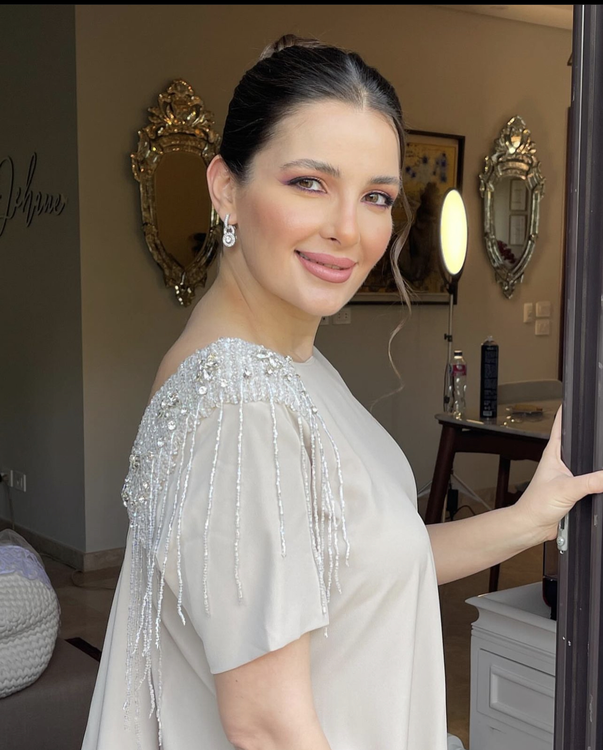 ووضعت شام الذهبي مكياجًا مختلفًا أبرز جمال عينيها، لتعتمد الألوان الصيفية الجريئة بشكل ناعم وهاديء، فإعتمدت ظلال العين باللون البنفسجي المدمج مع النود، وزينت وجنتيها ببلاشر باللون البني، كما اختارت أحمر شفاه باللون الوردي الفاتح؛ ليتماشى مع لون بشرتها وفستانها الجذاب.