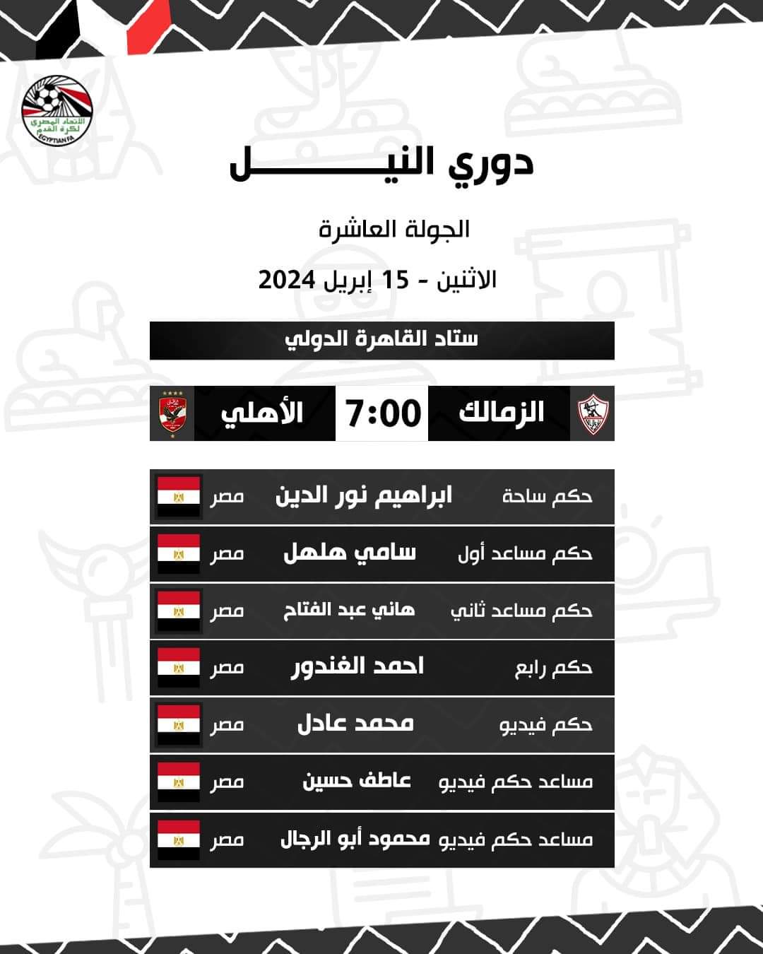 بينما يتولى تقنية الفيديو الحكم عاطف حسين ويساعده محمود أبو الرجال.