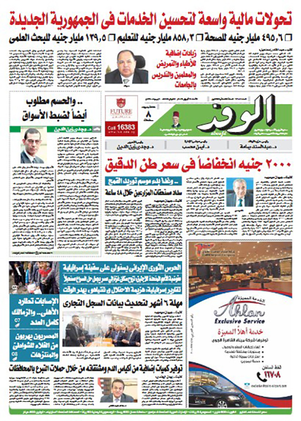 تنشر جريدة الوفد في عددها الصادر، غدًا الأحد، الكثير من الموضوعات والتقارير الإخبارية المهمة، أبرزها: "تحولات مالية واسعة لتحسين الخدمات في الجمهورية الجديدة".