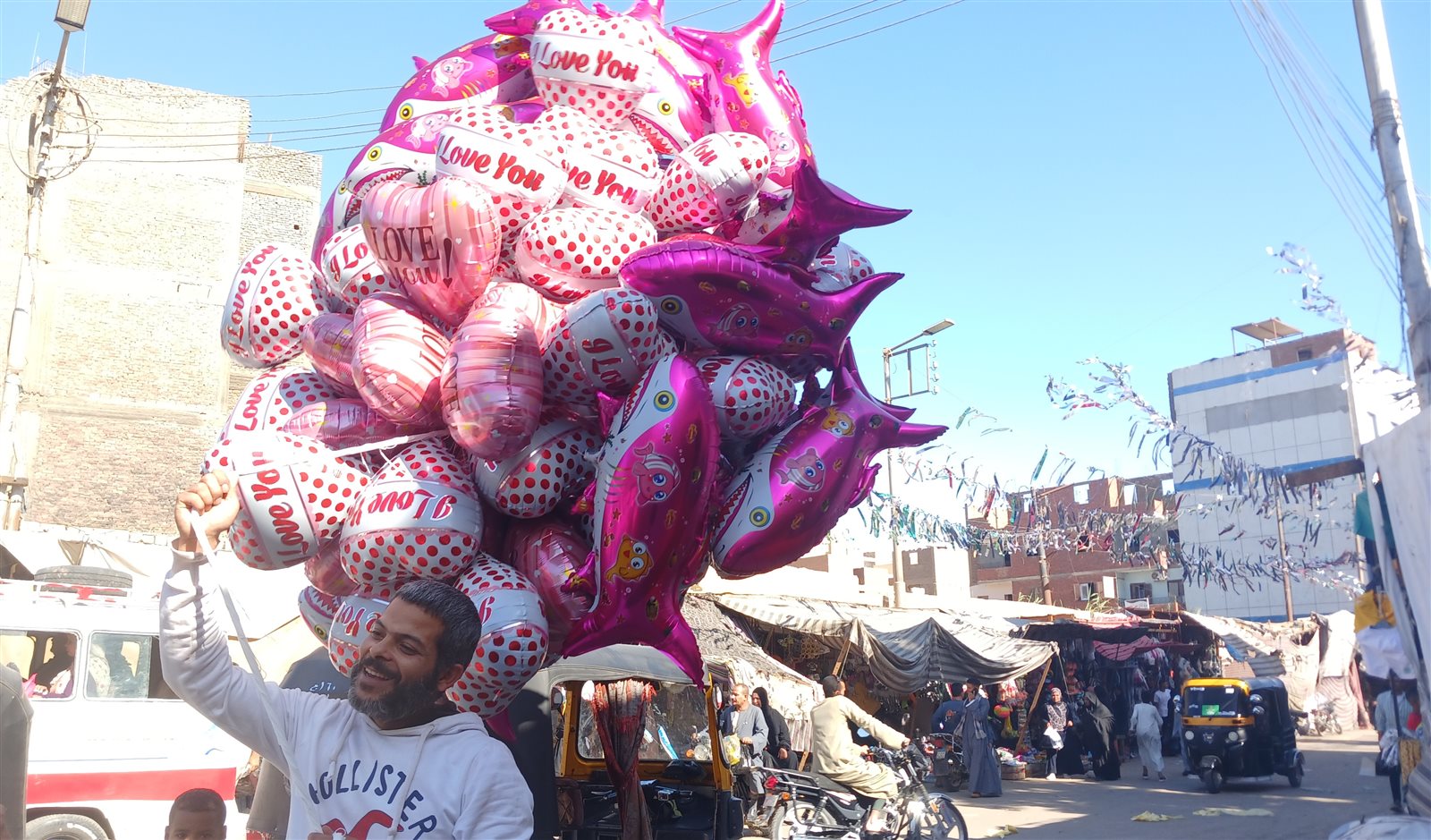 وسط شوارع مدينة إسنا بجنوب الأقصر، يتجول بخفة باسمًا وهو يشدو؛ لجذب المارة لشراء بالونات الهيليوم، التي تعد مصدر الدخل الوحيد لديه.