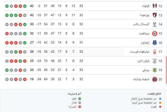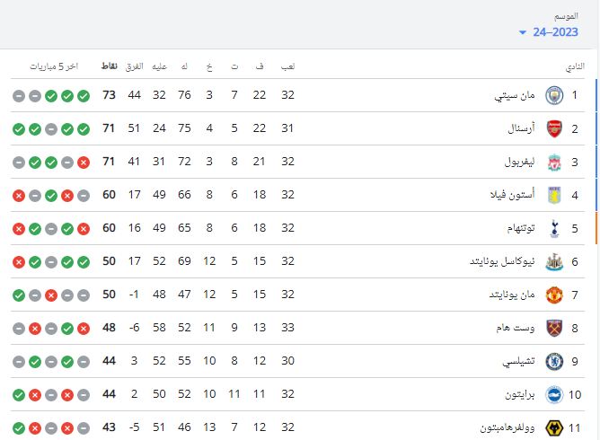 يحتل مانشستر سيتي صدارة الترتيب بـ 73 نقطة، بينما يأتي اَرسنال في الوصافة بـ 71 نقطة، وليفربول ثالث الترتيب بنفس رصيد الجانرز، لكن الأخير لديه مباراة مع أستون فيلا.