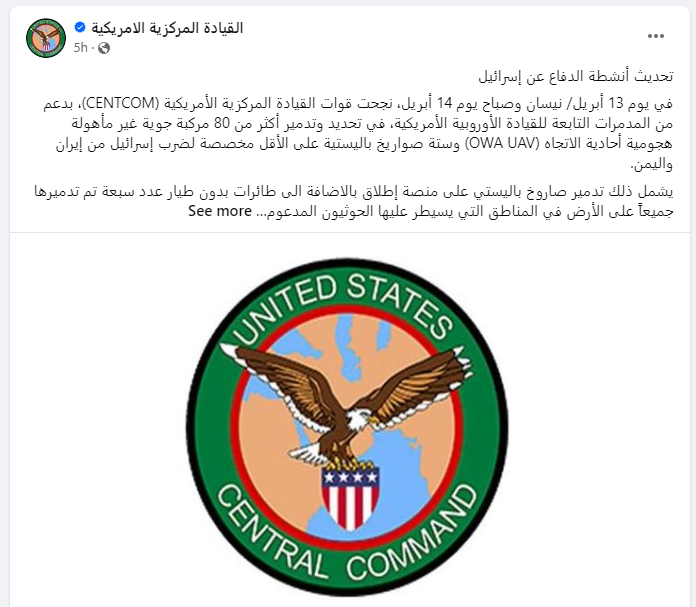 ونشرت القيادة عبر حسابها الرسمي باللغة العربية بموقع التواصل الاجتماعي "فيسبوك"، وقالت: "في يوم 13 أبريل، وصباح يوم 14 أبريل، نجحت قوات القيادة المركزية الأمريكية (CENTCOM)، بدعم من المدمرات التابعة للقيادة الأوروبية الأمريكية، في تحديد وتدمير أكثر من 80 مركبة جوية غير مأهولة هجومية أحادية الاتجاه (OWA UAV) وستة صواريخ باليستية على الأقل مخصصة لضرب إسرائيل من إيران واليمن".