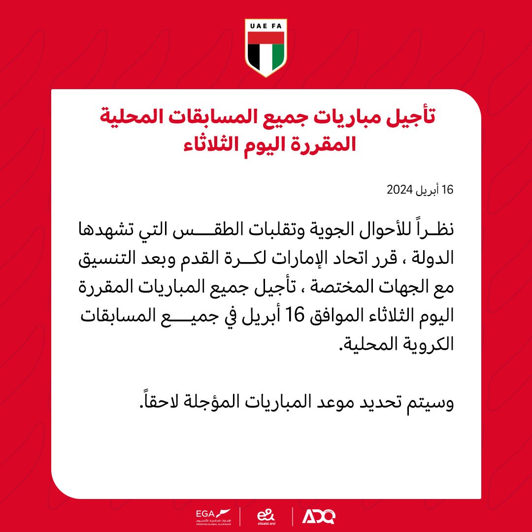 وكشف اتحاد الإماراتي في وقت سابق عن تأجيل كافة المنافسات المحلية بشكل رسمي حتى إشعار آخر بسبب سوء الأحوال الجوية.