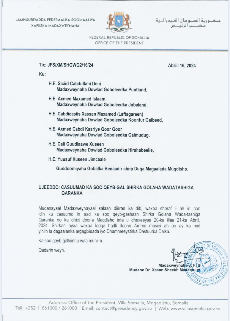 أصدر حسن شيخ محمود، رئيس الصومال، دعوات إلى قادة الولايات الإقليمية، لحضور مؤتمر تشاوري وطني من المقرر عقده في 20-21 أبريل في العاصمة مقديشو.