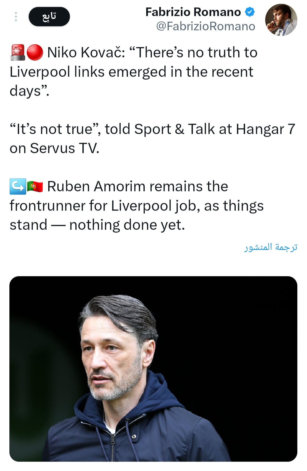 كما أكد الصحفي الموثوق “فابريزيو رومانو” أن روبن أموريم مدرب فريق سبورتينج لشبونة، هو المرشح الأوفر حظا حاليا لتدريب ليفربول، ولكن الأمور كما هي لم يحدث أي تطورات حتى الآن.