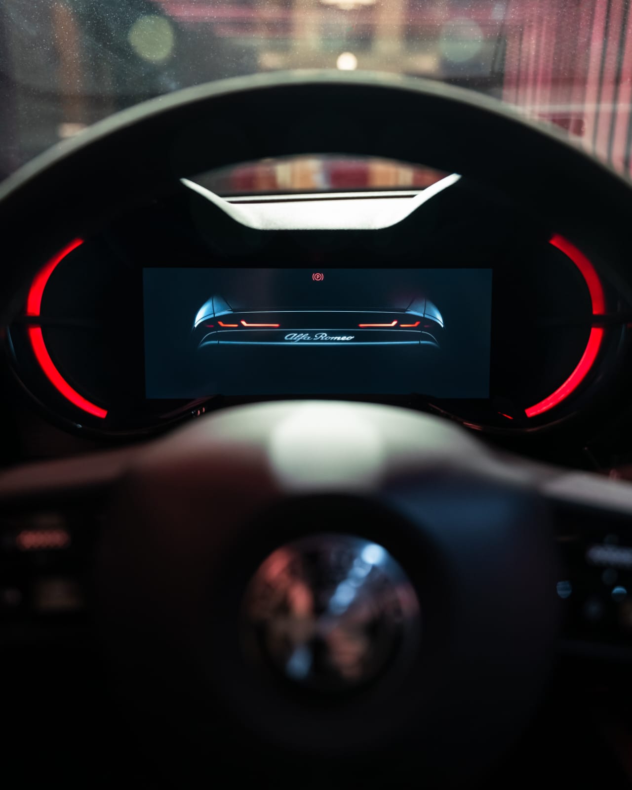 يمكن العثور على نفس الإلهام للطابع الرياضي الخالص داخل السيارة، حيث تتمثل المزايا البارزة في الاهتمام الإيطالي بكل التفاصيل، واستخدام أجود المواد ووضع جميع أدوات التحكم في متناول السائق، كما يتضح من عجلة القيادة المدمجة، للتكيف مع جميع أنماط القيادة. والأهم من ذلك كله، أن لوحة العدادات وتصميمها "التلسكوبي" التاريخي يخلق هذا الاتصال البصري المباشر ويقنعك بلف يديك حول عجلة القيادة، وتشغيل المحرك، وتحقيق أقصى استفادة من تجربة القيادة الفريدة. وفي وسط المجموعة، الميزة البارزة هي شاشة TFT رقمية بالكامل مقاس 10.25 بوصة للوصول إلى بيانات السيارة وإعدادات تقنيات القيادة. في منتصف لوحة القيادة يوجد نظام شاشة تعمل باللمس مقاس 10.25 بوصة موجه نحو السائق، تم تطويره للعمل مع عناصر واجهة المستخدم، والمكونات الرسومية المصممة للتفاعل البديهي مع جميع المزايا، والتي يمكن تخصيصها عبر السحب والإفلات السريع والسهل. يمكن لكل مستخدم إنشاء صفحته الرئيسية الخاصة، حيث تكون كل ميزة من مميزات السيارة عبارة عن تطبيق في حد ذاته.  ولزيادة تزيين المقصورة الداخلية، توجد فتحات تكييف الهواء على شكل كوادريفوليو، الرمز المميز لطابع ألفا روميو الرياضي. وأخيرًا، لجذب انتباه السائق والترحيب به، تم تجهيز مقاعد Sabelt الرياضية بمسند ظهر مغلف يجمع بين المقاومة الميكانيكية العالية وبيئة العمل المثالية وخفة الهيكل.