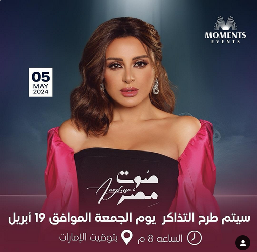 يقام حفل أنغام في 5 من مايو القادم، على أحد المسارح الكبرى بـ دبي، ويتم طرح التذاكر الليلة عبر الموقع الإليكتروني .
