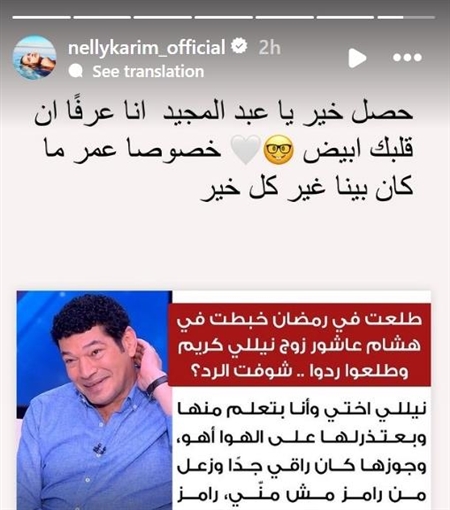 كتبت الفنانة “نيللي كريم” عبر خاصية "ستوري" في حسابها بموقع التواصل الاجتماعي إنستجرام: "حصل خير يا عبد المجيد، أنا عارفة إن قلبك أبيض خصوصا عمر ما كان بينا غير كل خير".
