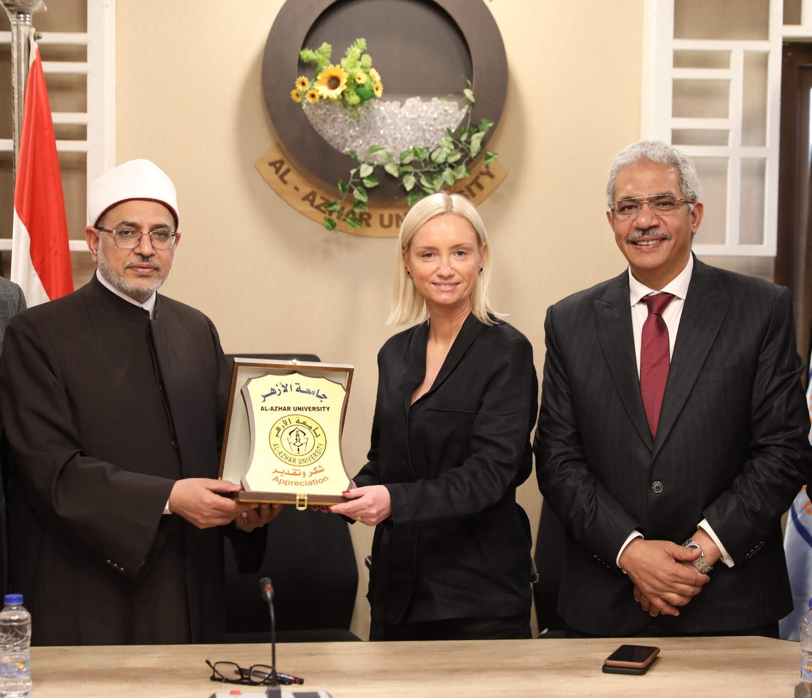 وفي ختام اللقاء قام الدكتور سلامة جمعة داود، رئيس الجامعة، بتكريم عميدة كلية السياسة العامة والإدارة بالأكاديمية الرئاسية الروسية ومنحها درع جامعة الأزهر، كما قامت فضيلتها بتكريم رئيس جامعة الأزهر.