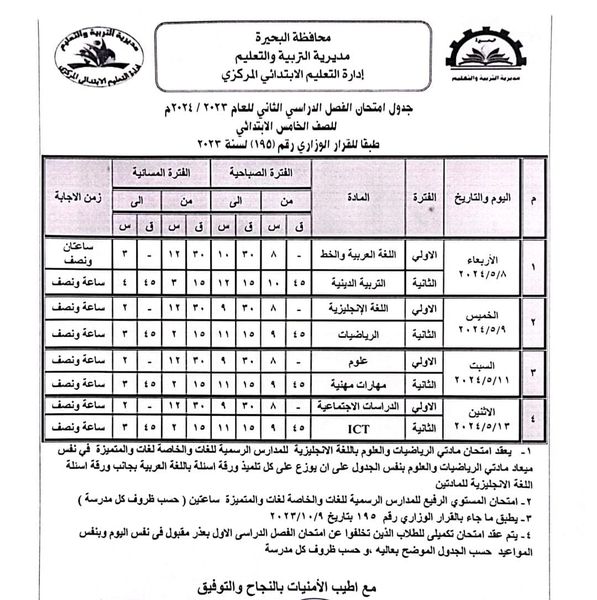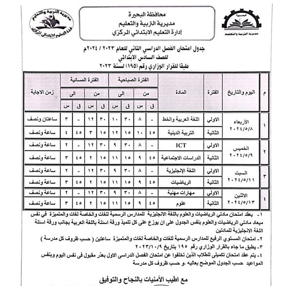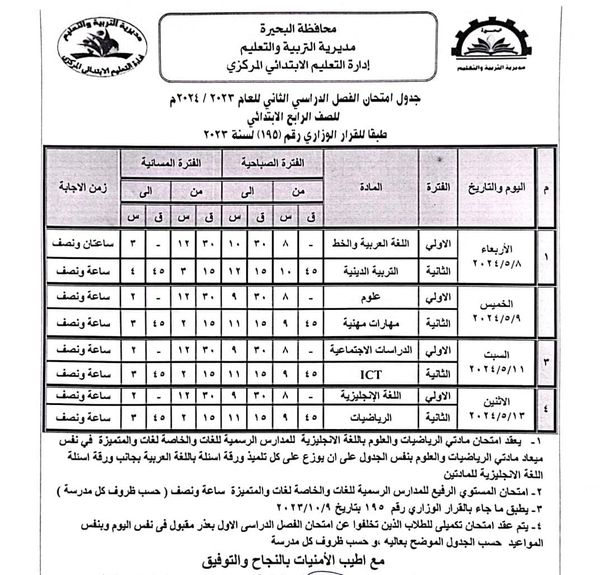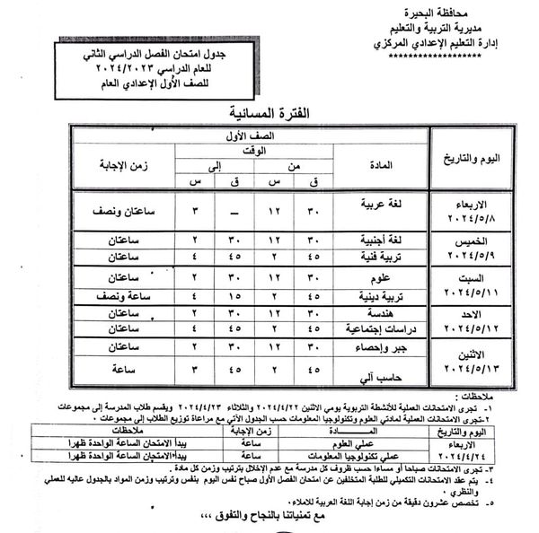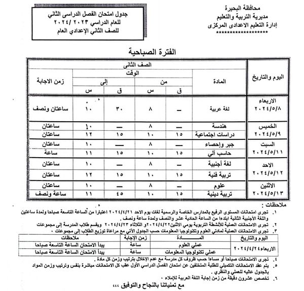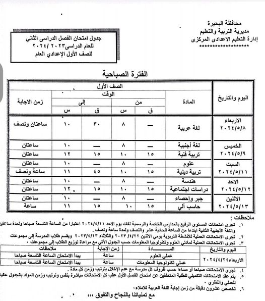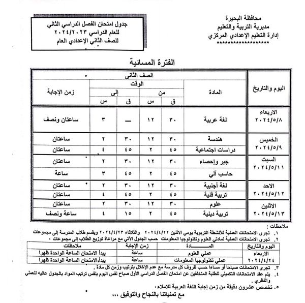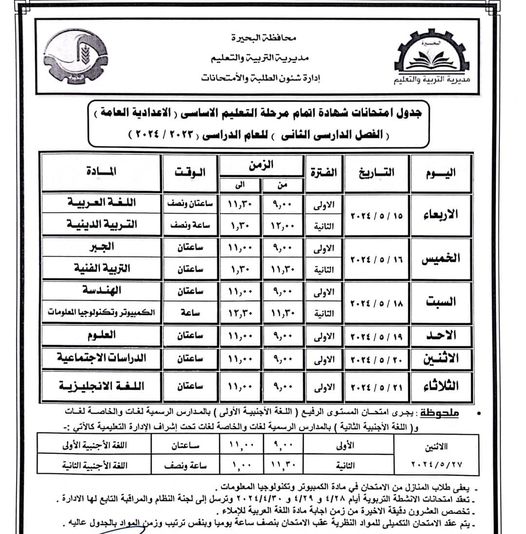 جدول امتحانات الفصل الدراسي الثاني للشهادة الإعدادية بالبحيرة