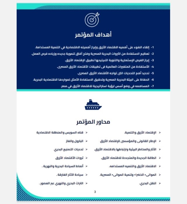 يناقش المؤتمر العديد من المحاور المهمة لتنمية الاقتصاد الأزرق وأفاق تفعيل المنطقة الاقتصادية أهمها محور الاقتصاد الأزرق والتنمية، وقناة السويس وتنمية المنطقة الصناعية، البترول والغاز، الإطار القانونى والمؤسسى للاقتصاد الأزرق، تحديات التصنيع البحرى، الآثار والمخاطر البيئية وارتباطها بالاقتصاد الأزرق، ثروات الاقتصاد الأزرق، الاقتصاد الازرق والتنمية المستدامة، أنماط السياحة البحرية والنهرية، الموانىء الخضراء وتنمية الموانىء المصرية، سياحة الآثار الغارقة، النقل البحرى، التراث البحرى والنهرى عبر العصور.