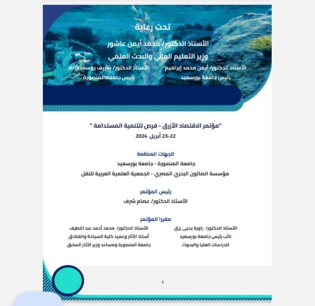 تعقد جامعتا المنصورة وبورسعيد، بالتعاون مع مؤسسة الصالون البحري المصري والجمعية العلمية العربية للنقل، مؤتمرًا بعنوان: الاقتصاد الأزرق فرص للتنمية المستدامة يومي 22 أبريل بجامعة المنصورة و23 أبريل بجامعة بورسعيد.