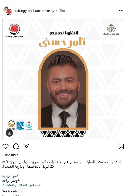 وقد أعلن مجلس القبائل والعائلات المصرية عبر صفحته بموقع إنستجرام عن حفل تامر حسني، إذ كتبت الصفحة: انتظروا نجم مصر الفنان تامر حسني في احتفاليات ذكرى تحرير سيناء؛ يوم 25 ابريل بالعاصمة الإدارية الجديدة.