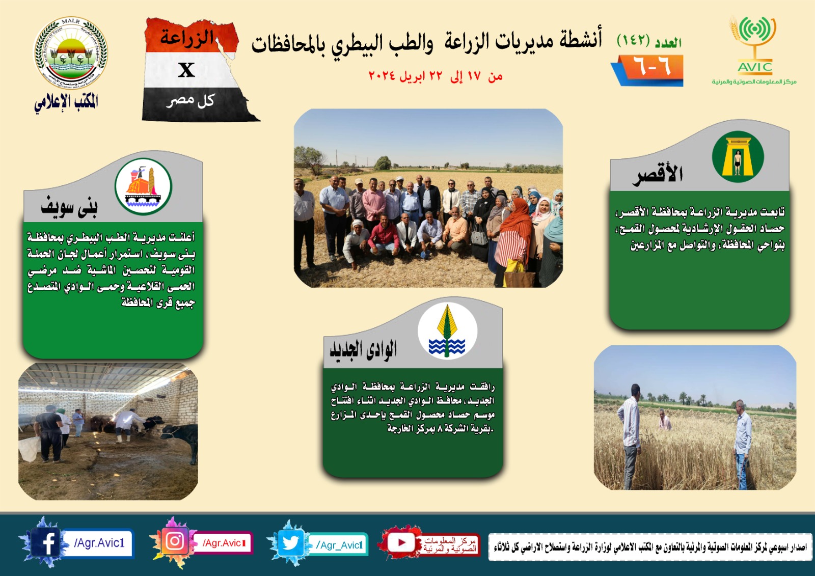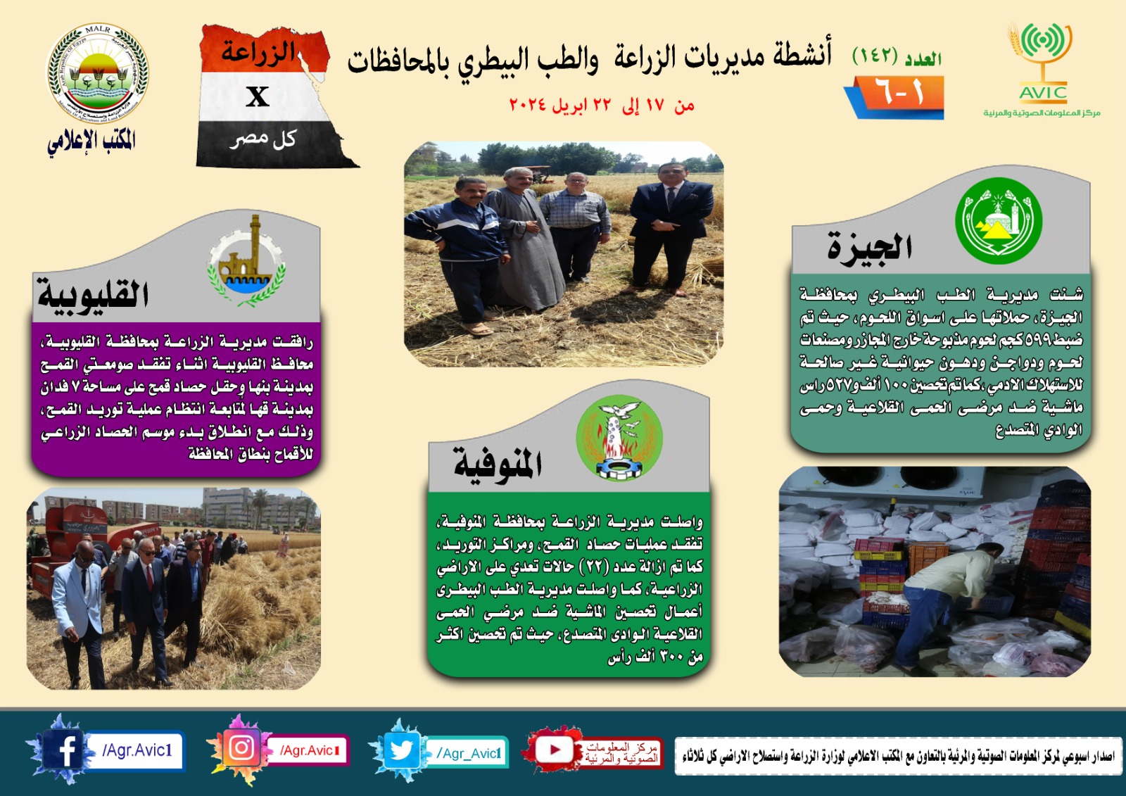 أصدر مركز المعلومات الصوتية والمرئية التابع لوزارة الزراعة واستصلاح الأراضي، والمكتب الاعلامي للوزارة، العدد رقم ١٤٢ من اصدار: "الزراعة في كل مصر" بالانفوجراف والفيديو، يوضح الجهود والانشطة التي تقوم بها مديريات الزراعة والطب البيطري بمحافظات الجمهورية خلال الفترة من ١٧ وحتى ٢٢ ابريل الجاري.