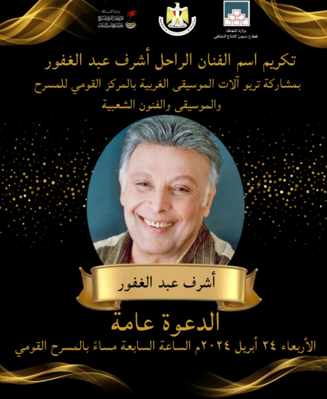 تحت رعاية وزيرة الثقافة الأستاذة الدكتورة نيفين الكيلاني، وإشراف رئيس قطاع شئون الإنتاج الثقافي المخرج الكبير خالد جلال؛ يقيم المركز القومي للمسرح والموسيقى والفنون الشعبية برئاسة الفنان إيهاب فهمي؛ احتفالية كبرى لتكريم اسم الفنان الكبير الراحل أشرف عبد الغفور؛ بحضور رموز ونجوم الفن المصري، وذلك في السابعة مساء غدا الأربعاء ٢٤ أبريل ٢٠٢٤م، بالمسرح القومي.