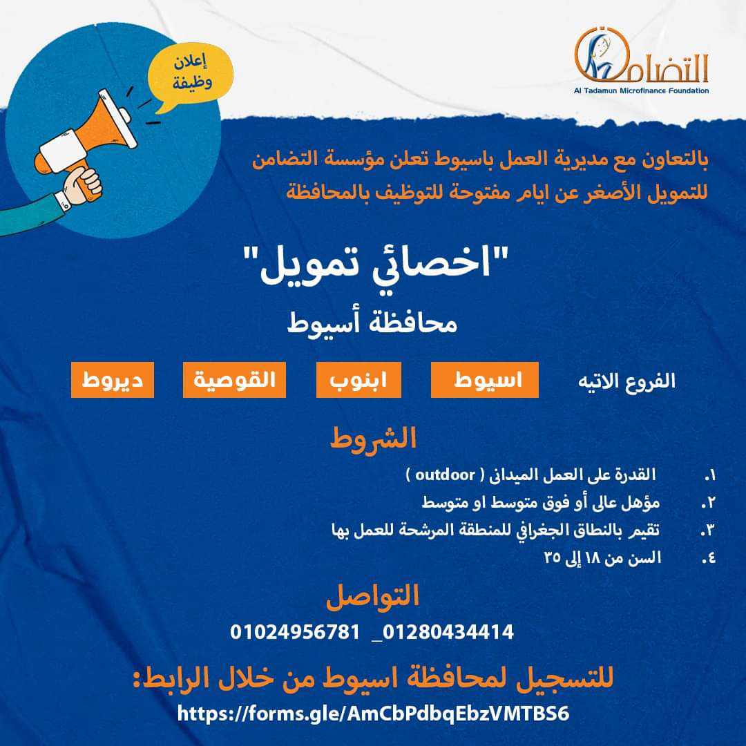 أعلنت وزارة العمل اليوم، من خلال الإدارة العامة للتشغيل عن تنظيم 4 أيام مفتوحة للتوظيف بالتعاون مع مديرية العمل بمحافظة أسيوط على وظيفة "أخصائي تمويل" للعمل بمؤسسة التضامن للتمويل الأصغر بفروع: أسيوط، وأبنوب، والقوصية، وديروط بمحافظة الغربية، للفتيات من حملة المؤهلات العليا والمتوسطة وفوق المتوسطة، من المقيمين بالنطاق الجغرافي للمنطقة المرشحين للعمل بها، من سن 18 إلى 35 سنة. وتبدأ الرواتب من 4565 جنيهًا، بالإضافة إلى حوافز ومتغيرات، وتأمين صحى عام وخاص، وتأمينات اجتماعية، وفرص للترقي، ووثيقة تأمين على الحياة.